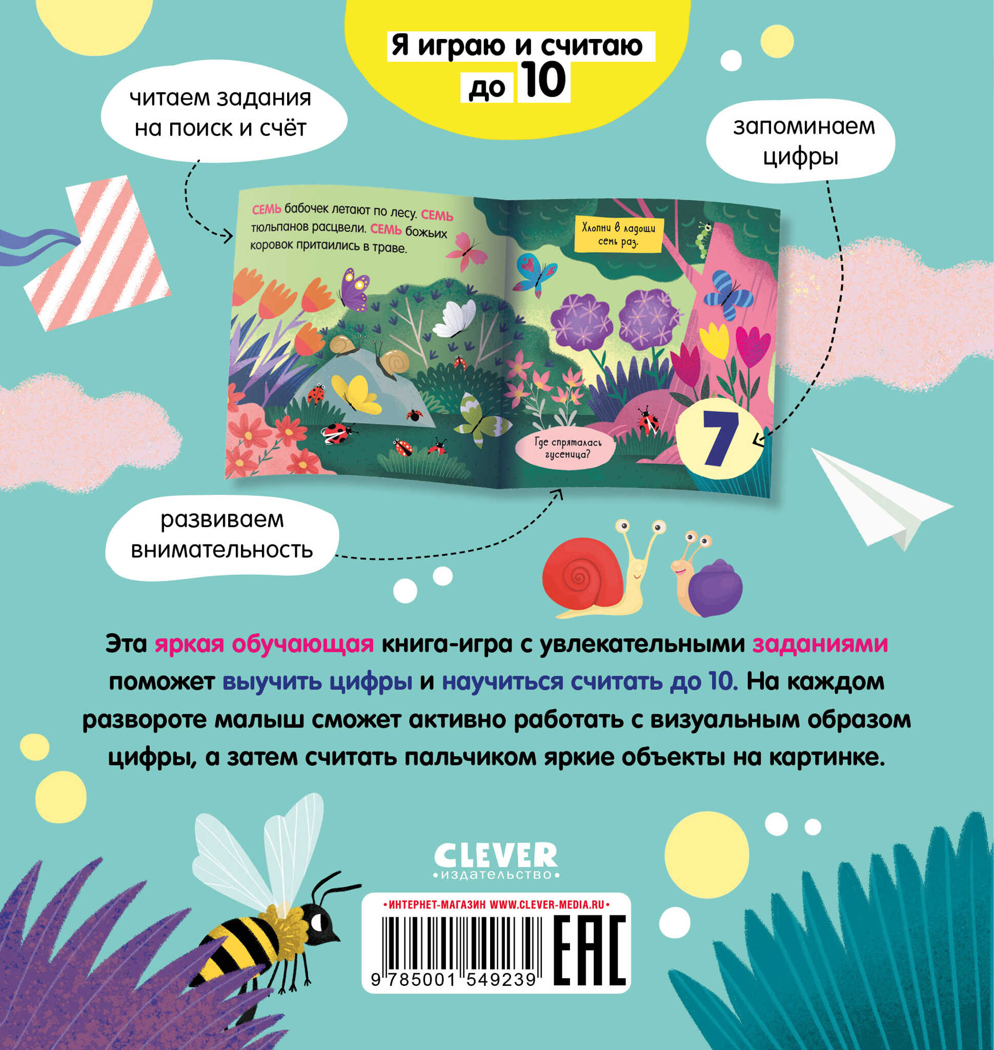 Handling time: 19 days Найди и покажи, малыш. Цифры. Я играю и считаю до 10 Эта яркая обучающая книга-игра с увлекательными заданиями поможет выучить цифры и научиться считать до 10. На каждом развороте малыш сможет активно работать с визуальным образом цифры, а затем считать пальчиком яркие объекты на картинке. • читаем задания на поиск и счёт • запоминаем цифры • развиваем внимательность