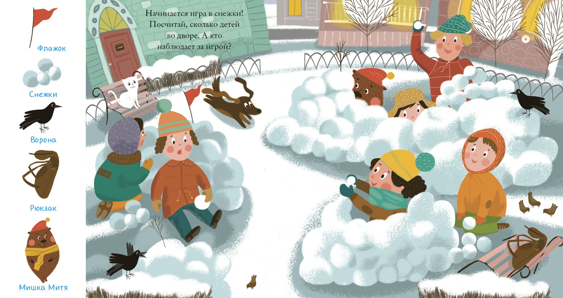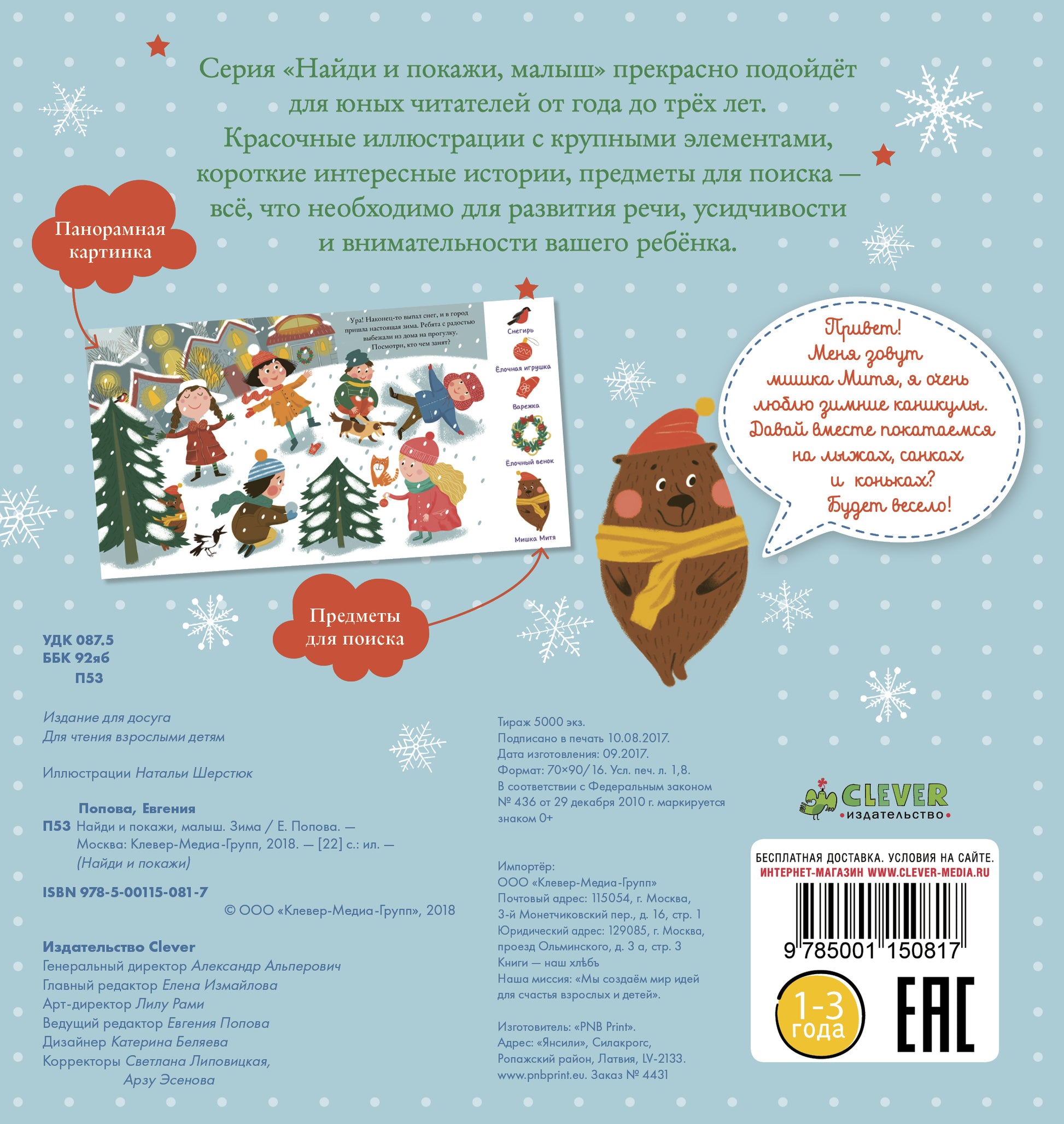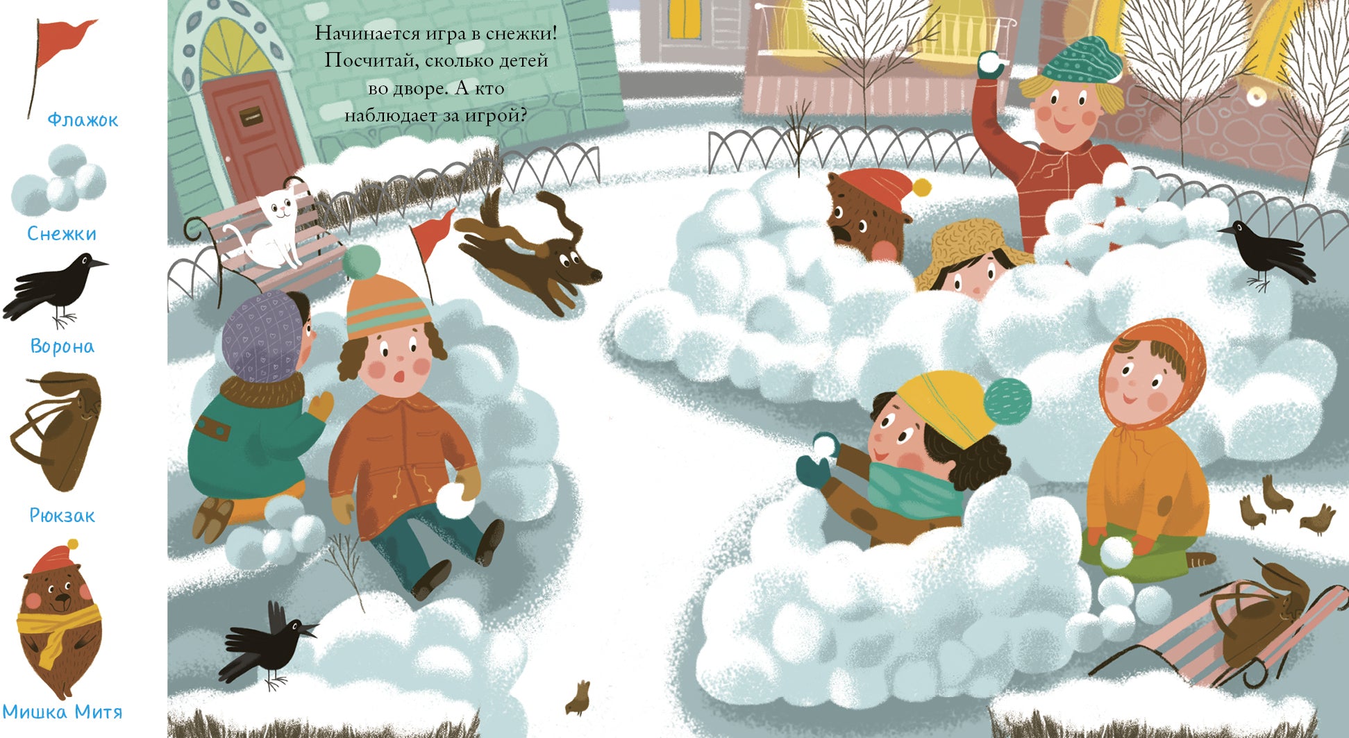 Handling time: 19 days Возраст 3+Фишки:- Любимая игра "Найди и покажи" для самых маленьких- Играем с мамой, развиваем речь, внимание, логику- В серии продано более 440 000 экземпляровУра! Наконец-то выпал снег, и в город пришла настоящая зима. Ребята с радостью выбежали из дома на прогулку. Посмотри, кто чем занят? Пока ребенок рассматривает картинки и ищет предметы, он будет знакомиться с окружающим миром и узнает, как можно весело проводить время зимой.Каждая страница - это целый мир, в котором нужно найти 5 спрятанных предметов. Многие предметы ребенок с радостью узнает, а с некоторыми познакомится впервые. Один симпатичный герой проведет вас через всю книжку! Его нужно будет найти и показать на каждом развороте.Лайфхак для родителей- Листайте книжку вместе и спрашивайте у ребенка, какие предметы ему знакомы, что как называется, где он видел то, что нарисовано на картинке- Расскажите малышу истории, связанные с предметами на картинках- Осваивайте новые слова, цвета и формы- Удобный формат позволяет брать книжку в дорогу и на прогулку- Обязательно хвалите ребенка за стараниеЧто развиваем?- Внимание- Память- Усидчивость- Расширяем словарный запас