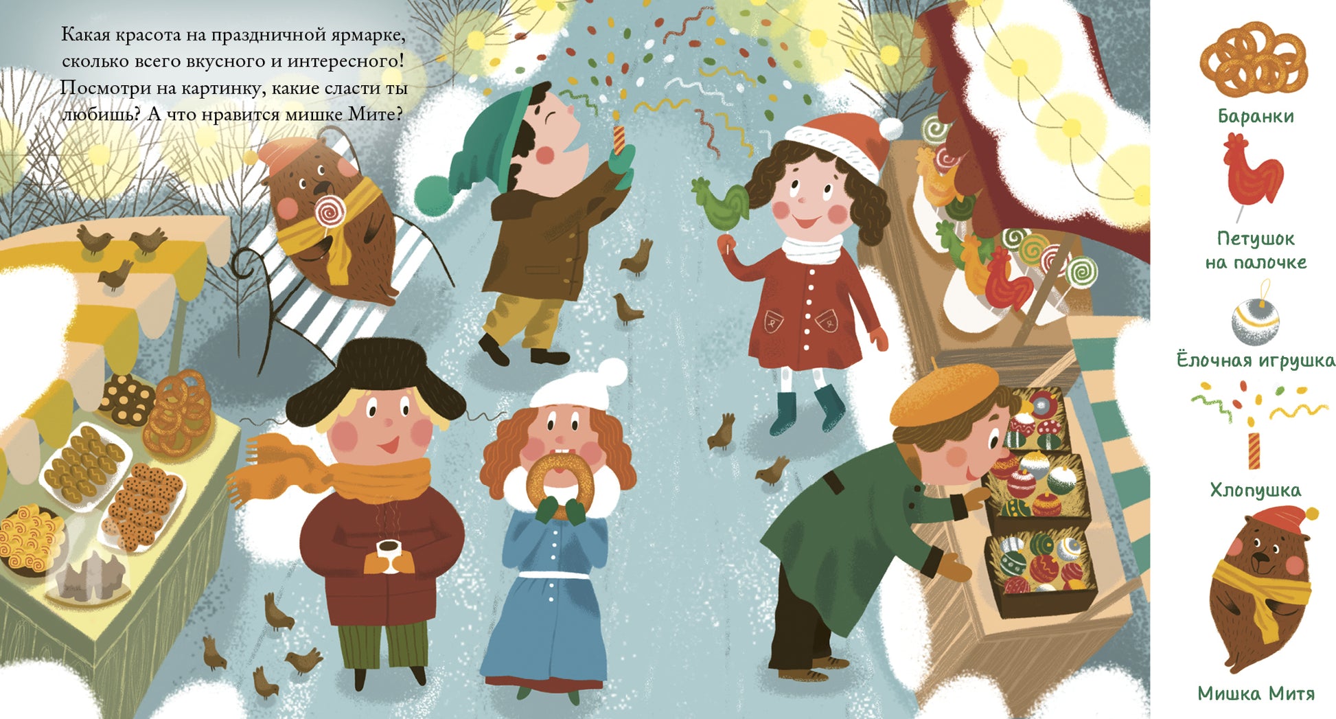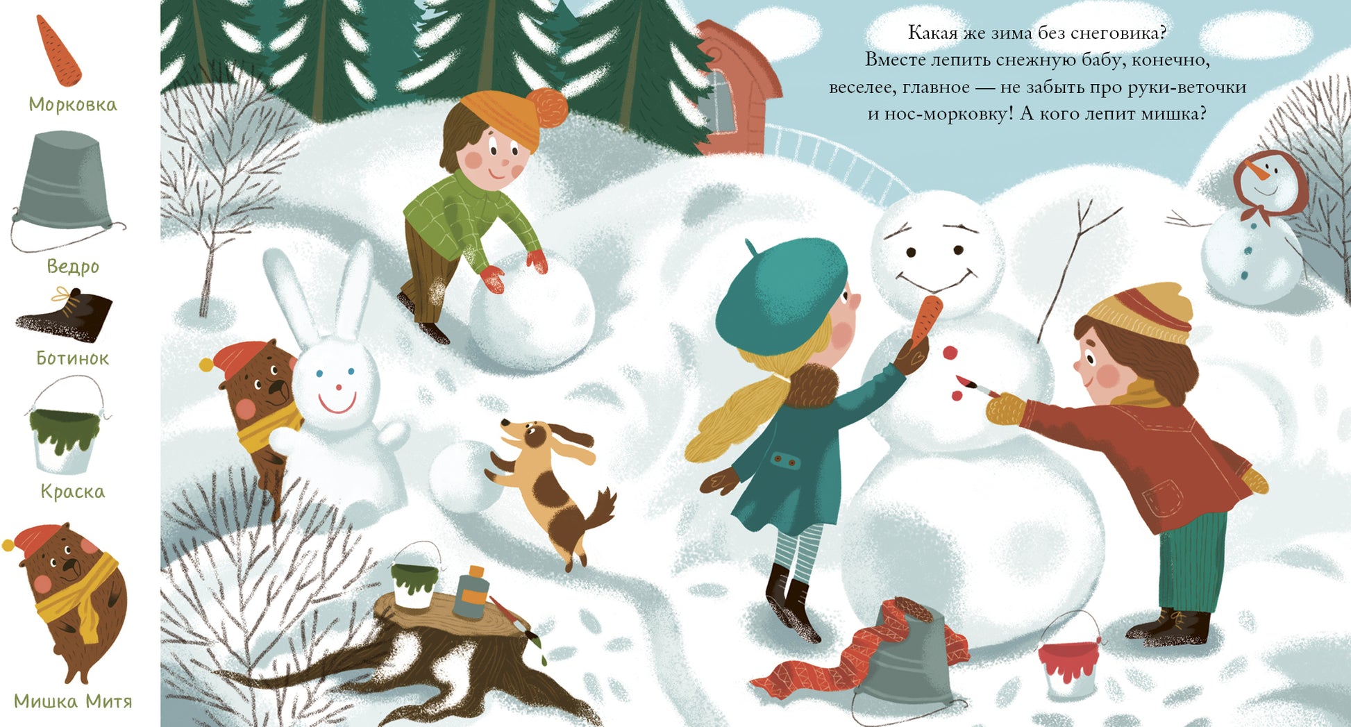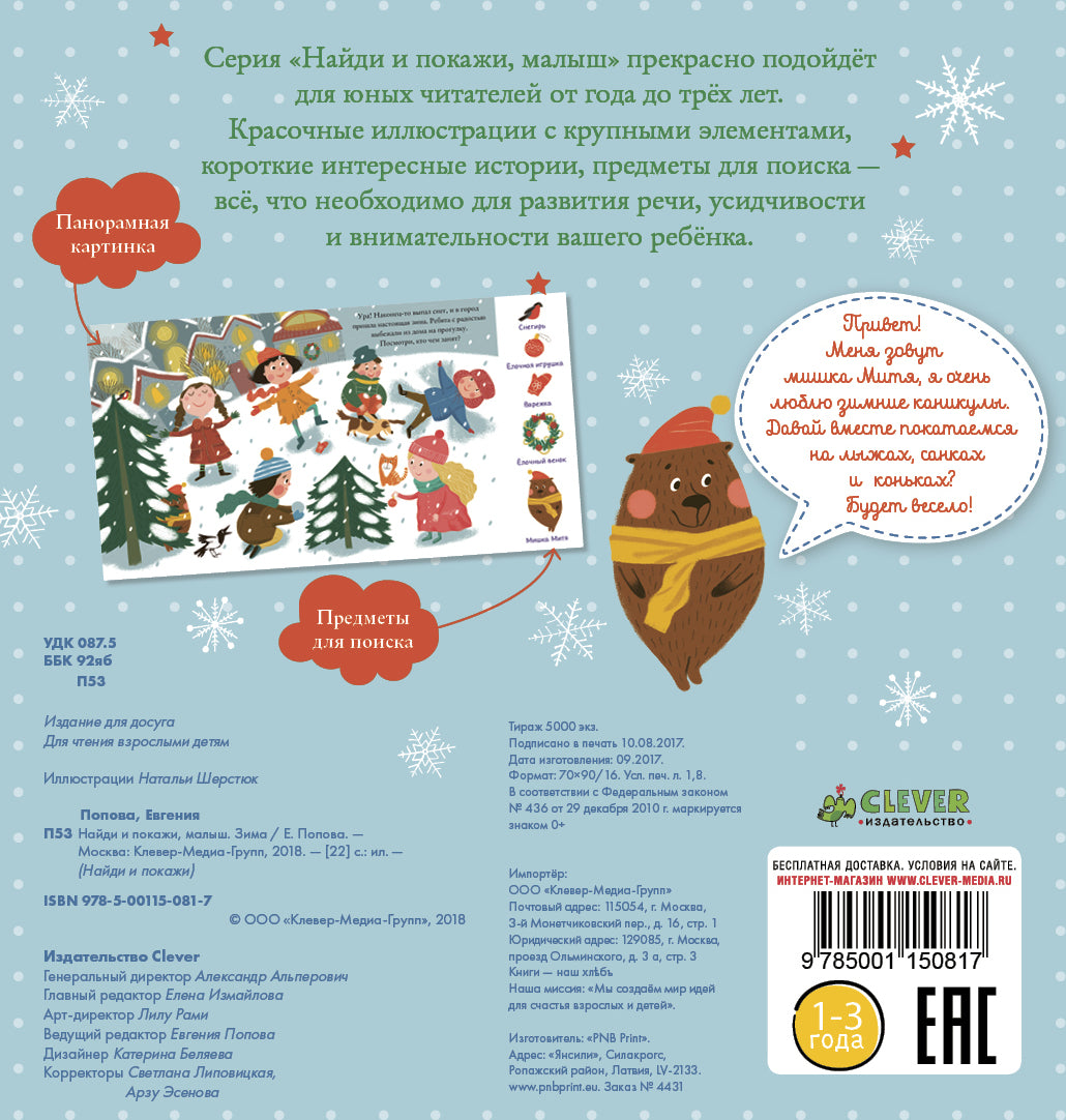 Handling time: 19 days Возраст 3+Фишки:- Любимая игра "Найди и покажи" для самых маленьких- Играем с мамой, развиваем речь, внимание, логику- В серии продано более 440 000 экземпляровУра! Наконец-то выпал снег, и в город пришла настоящая зима. Ребята с радостью выбежали из дома на прогулку. Посмотри, кто чем занят? Пока ребенок рассматривает картинки и ищет предметы, он будет знакомиться с окружающим миром и узнает, как можно весело проводить время зимой.Каждая страница - это целый мир, в котором нужно найти 5 спрятанных предметов. Многие предметы ребенок с радостью узнает, а с некоторыми познакомится впервые. Один симпатичный герой проведет вас через всю книжку! Его нужно будет найти и показать на каждом развороте.Лайфхак для родителей- Листайте книжку вместе и спрашивайте у ребенка, какие предметы ему знакомы, что как называется, где он видел то, что нарисовано на картинке- Расскажите малышу истории, связанные с предметами на картинках- Осваивайте новые слова, цвета и формы- Удобный формат позволяет брать книжку в дорогу и на прогулку- Обязательно хвалите ребенка за стараниеЧто развиваем?- Внимание- Память- Усидчивость- Расширяем словарный запас