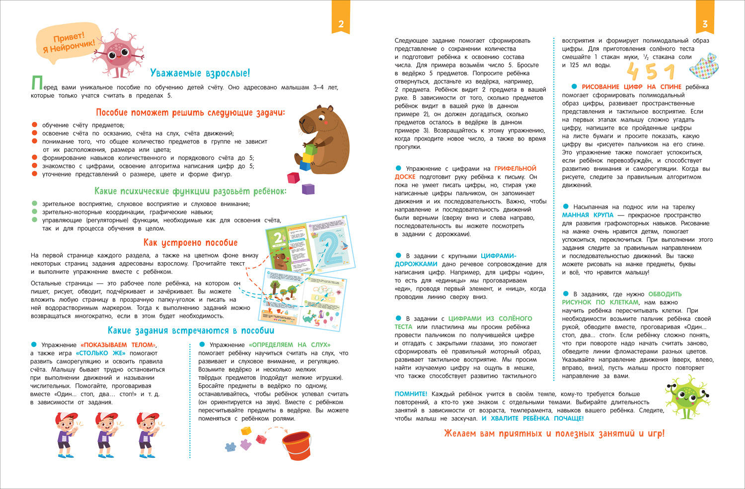 Handling time: 19 days В этом пособии собраны увлекательные задания для детей 3– 4 лет. С их помощью ребёнок в игровой форме познакомится с числами от 1 до 5, научится пересчитывать предметы, писать цифры, разовьёт восприятие, внимание и саморегуляцию