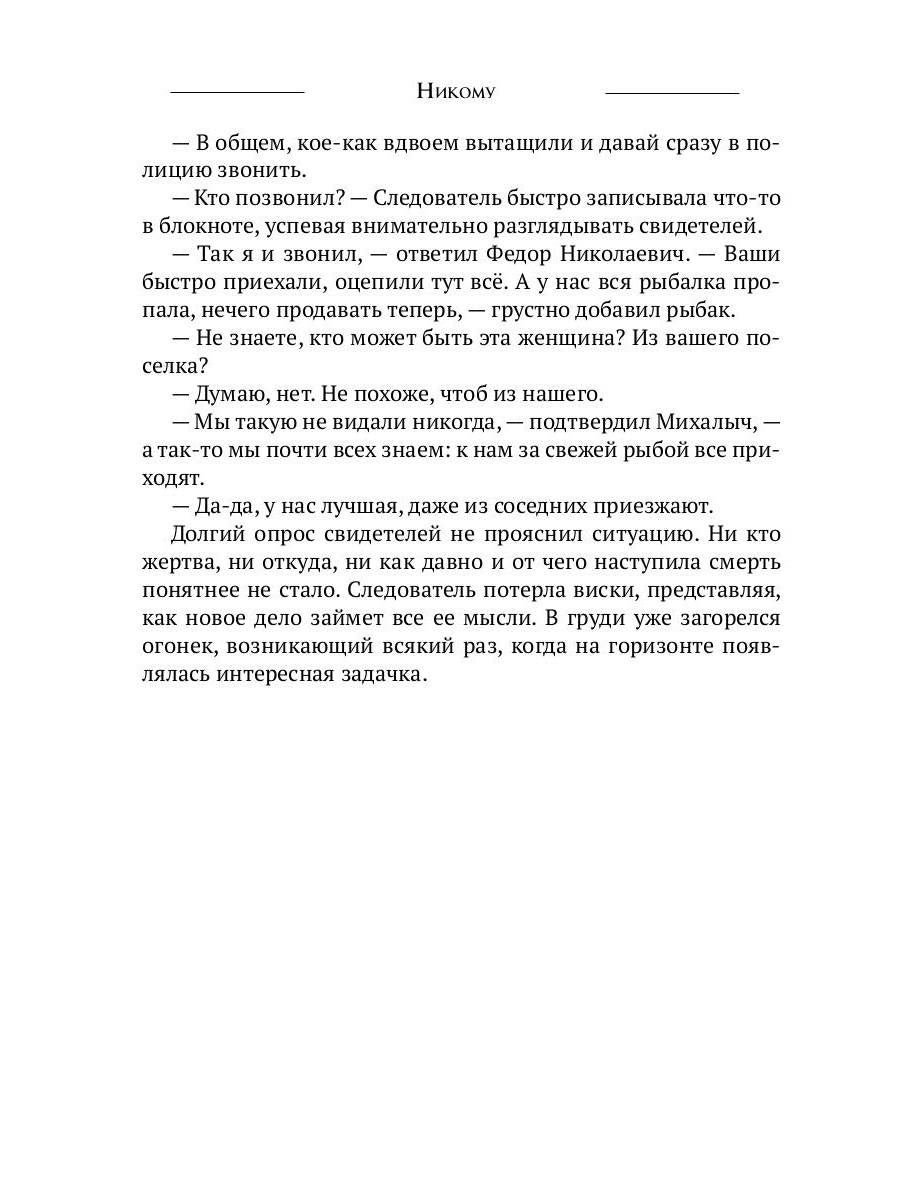 Автор: Денисова Кристина, «Никому»: Следователь Морозова легко раскрывает сложные дела. Ее считают гением, но работать с ней - нет, увольте. Слишком сложный характер. Помощник следователя Зотов намерен стать правой рукой Морозовой. Новое задание - шанс пережить себя. Найденное в реке тела неизвестных женщин, пропажа трехлетних девочек и последователей, пришло к основательнице психологической группы поддержки "Кубок Истины". Эмилия не может выдержать с утра такую едва родившуюся малышку и обращаться за помощью к психологу. Людмила окружает ее заботой и заменяет мать. Эмилии становится легче, ведь в ее жизни появляется цель - познать Истину. Вместе с единомышленниками она проходит испытания и занимает место рядом с Магистром.
