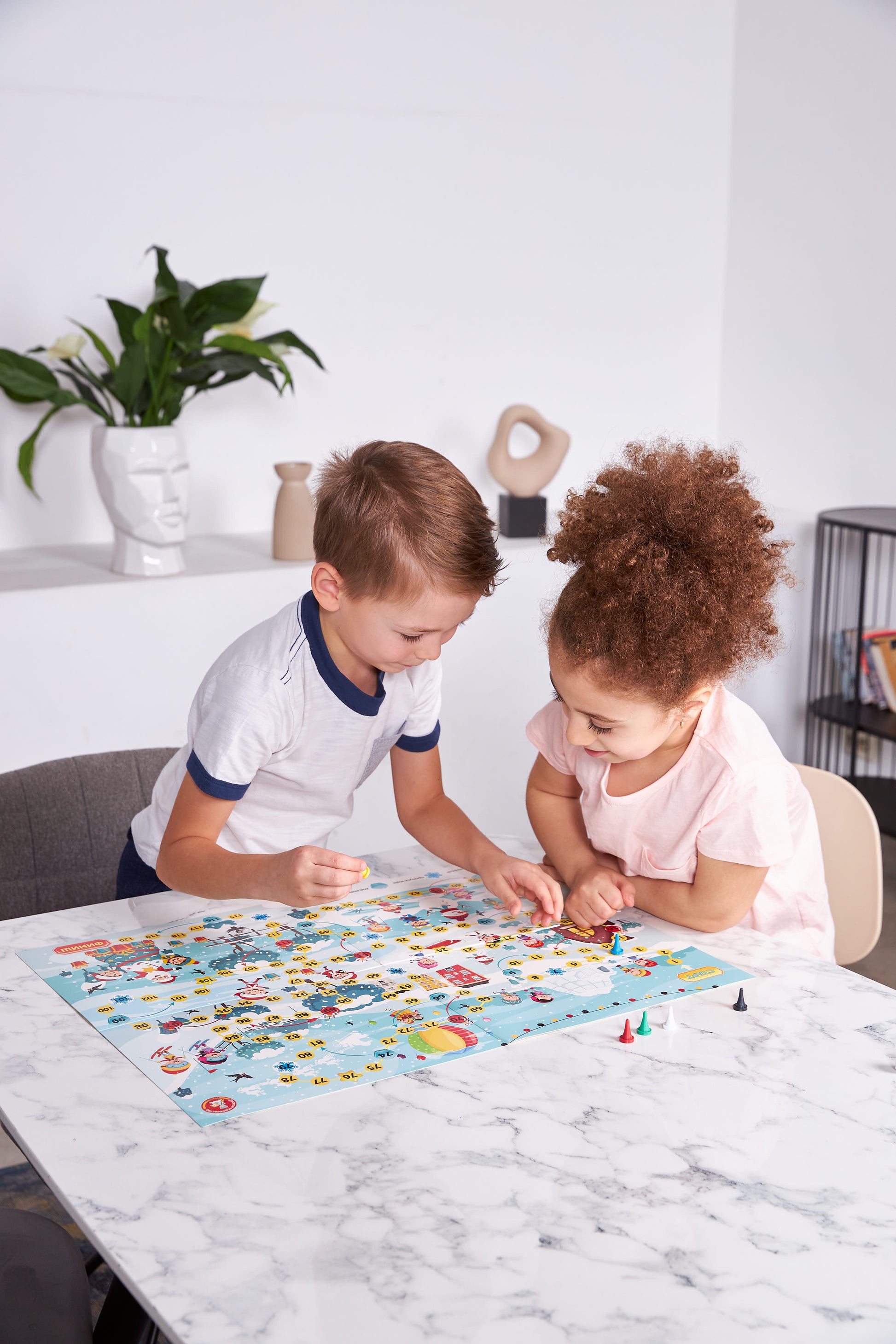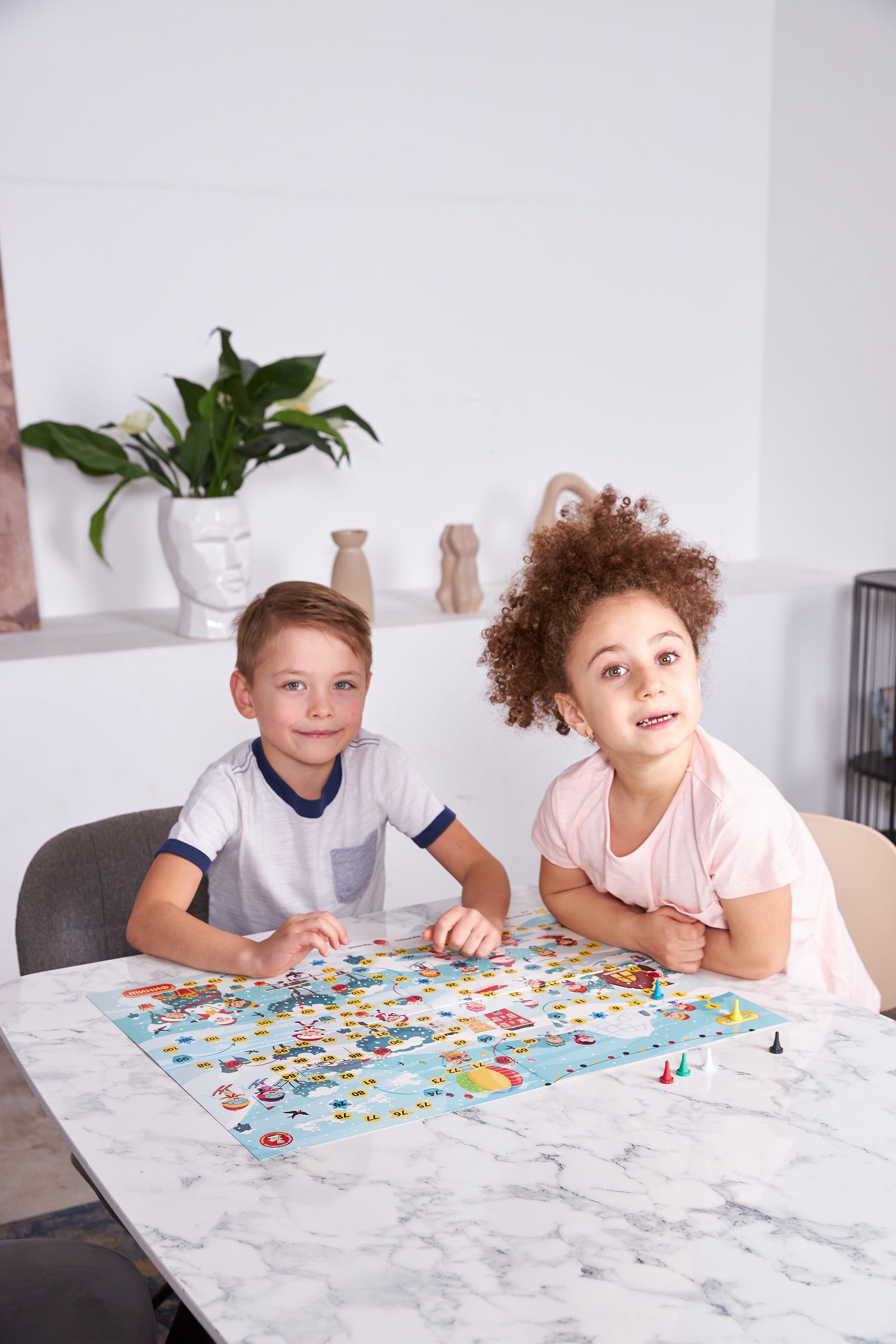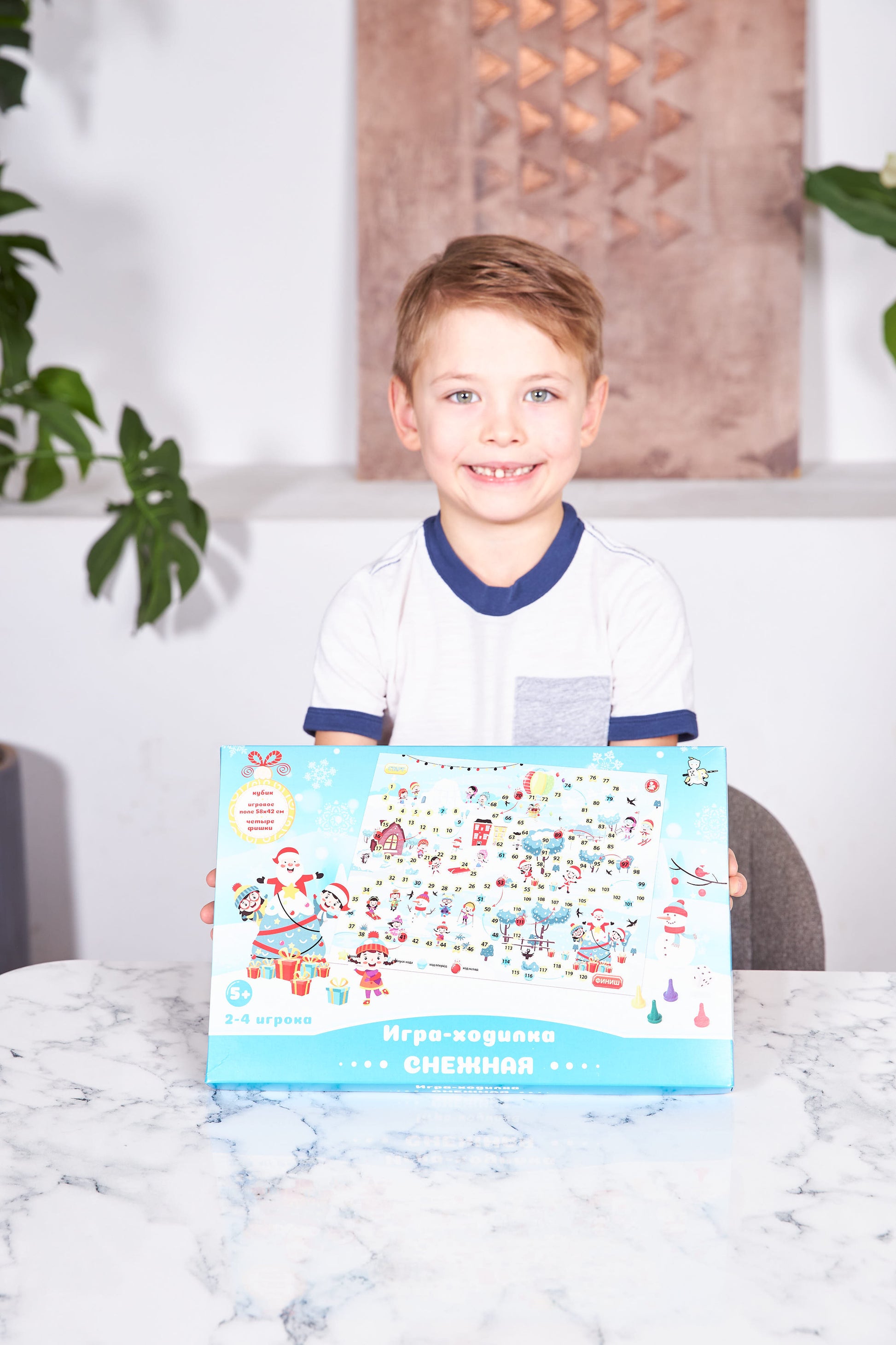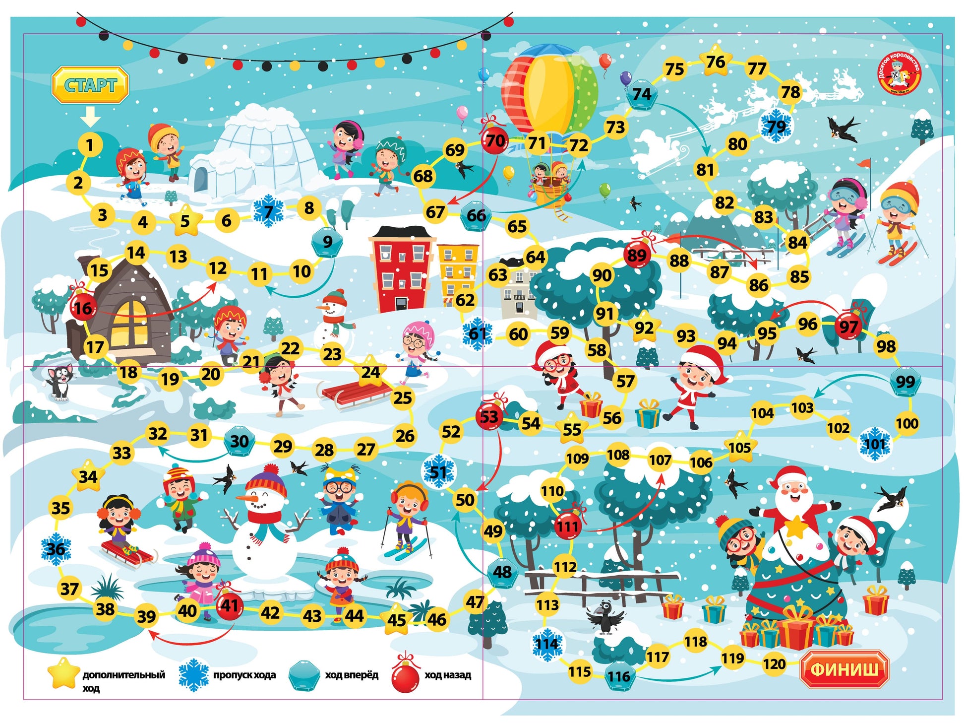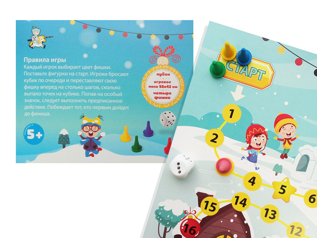Игра-ходила «Снежная». Состав игры:Игровое поле (42х58 см) - 1 шт., фишки - 4 шт., игровой кубик - 1 шт., инструкция. Игра рассчитана на 2-4 игроков и рассчитана на детей от 5 лет. Материалы: картон, полимерные материалы.