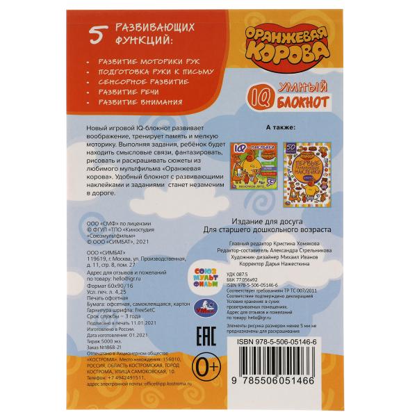 Handling time: 14 days Умный IQ-блокнот «Оранжевая корова» ТМ «УМка» непременно понравится маленькому поклоннику одноимённого мультсериала:- 35 красочных наклеек- 50 интересных заданий- любимые персонажи- цветные и чёрно-белые страничкиРебёнок интересно и с пользой провед