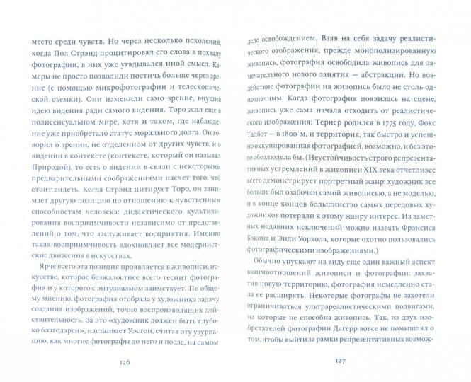 "Все началось с одного эссе – о некоторых эстетических и моральных проблемах, возникающих в связи с вездесущностью фотографических изображений; но чем больше я думала о том, что такое фотография, тем более сложными и увлекательными представлялись эти проблемы. Так что из одного эссе вытекало другое, а потом (к моему удивлению) еще одно. Получилась цепочка статей о значении и развитии фотографии, которая завела меня так далеко, что соображения, очерченные в первой, продолженные и задокументированные в последующих, можно было суммировать и расширить более теоретическим образом – и на этом остановиться".