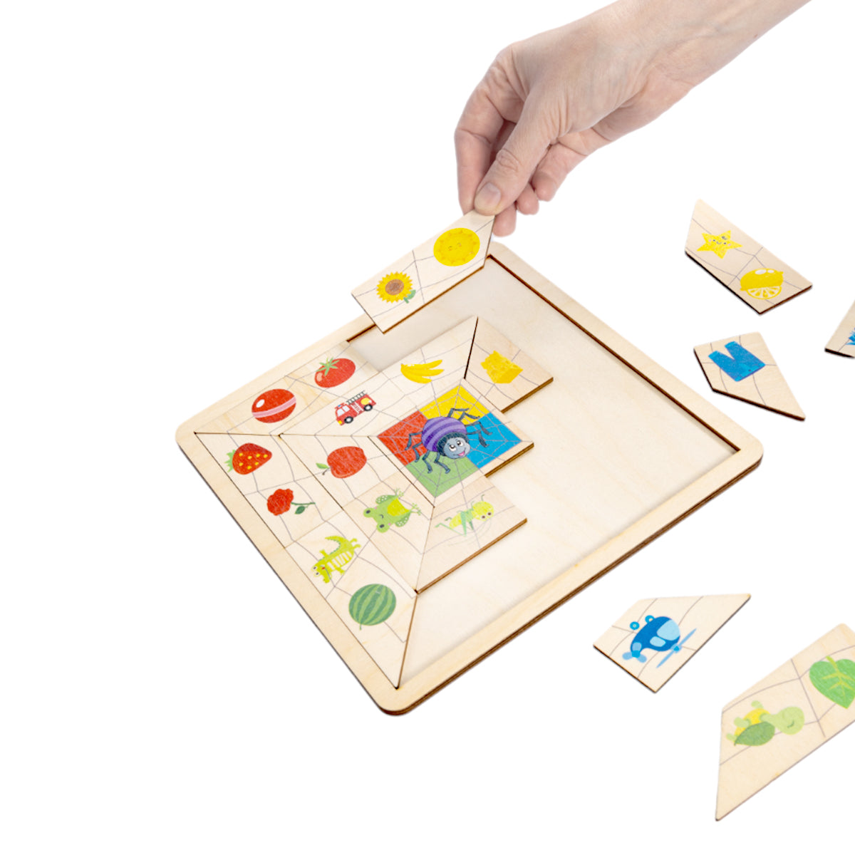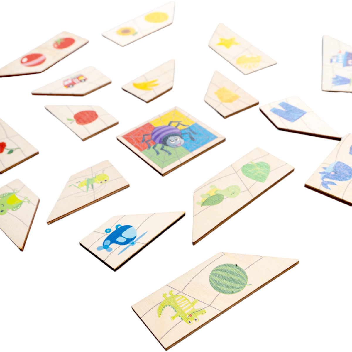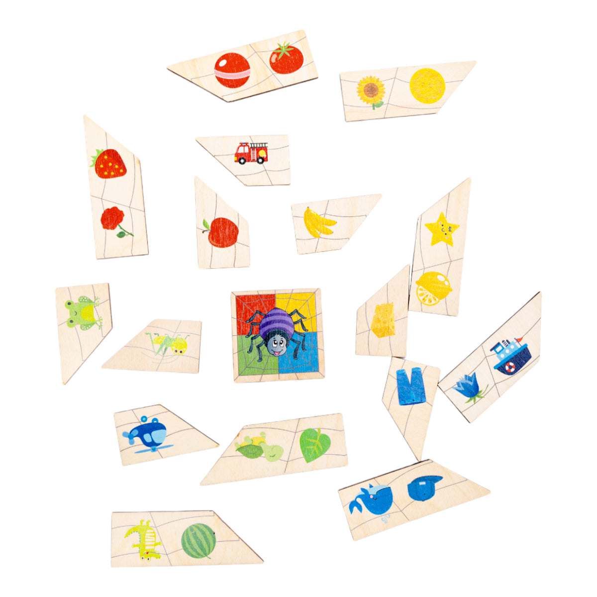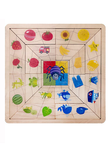 Пазлы из дерева "Паучок" Цвета. Состав игры:игровое поле (21х21 см) - 1 шт., пазлы с рисунком (длина – от 6 до 9 см, ширина – 3,3 см) – 17 шт.Материал: березовая фанера. Для детей старше 3 лет