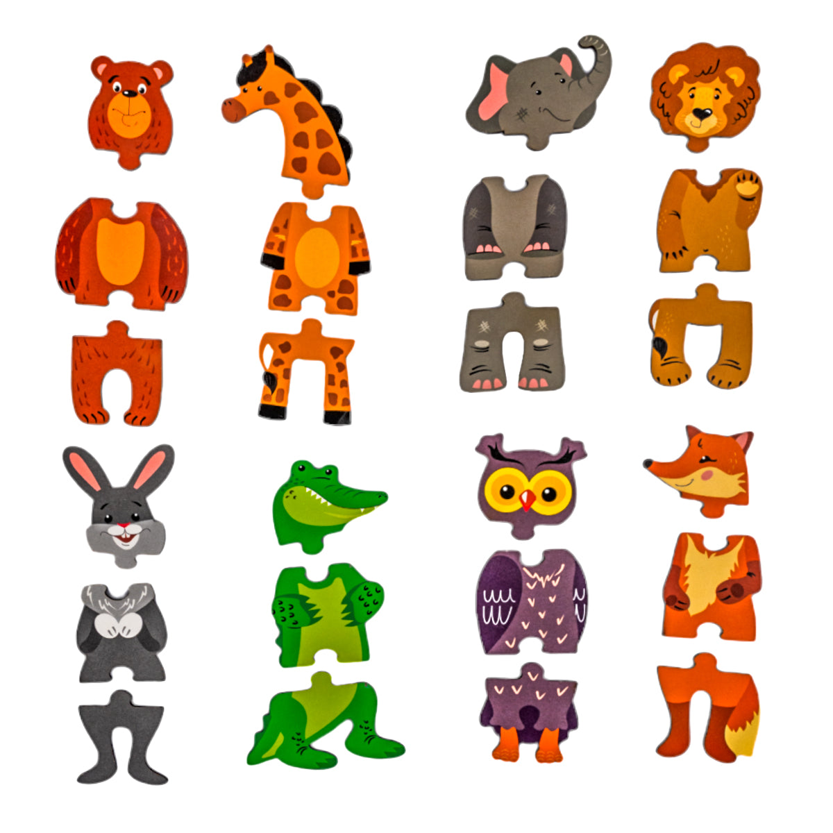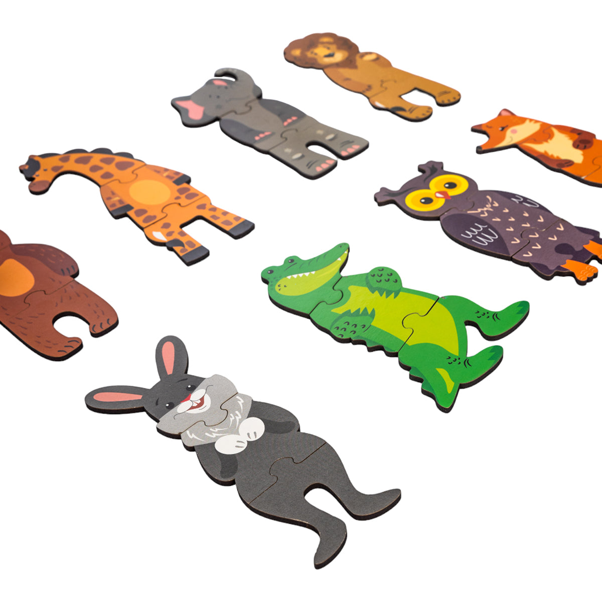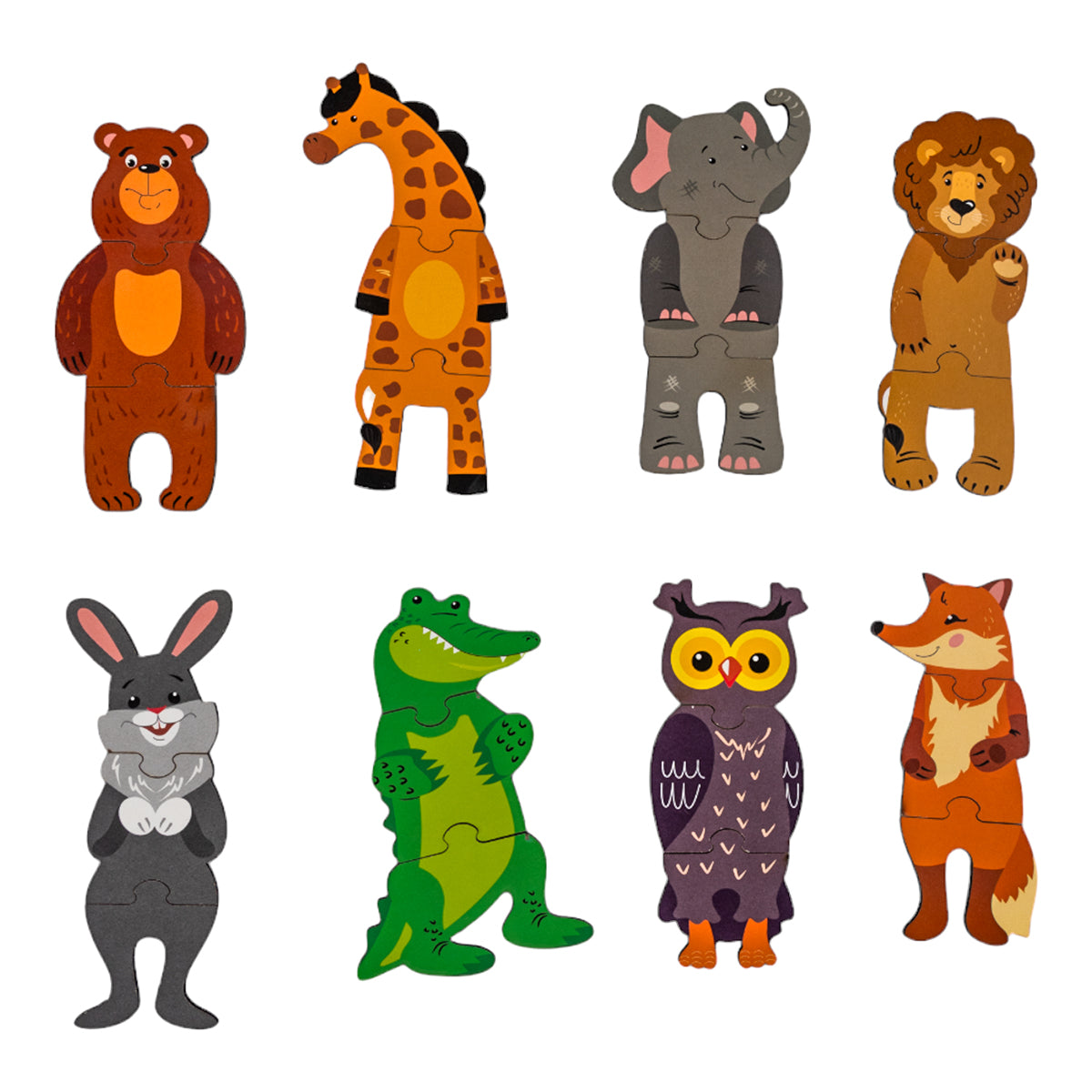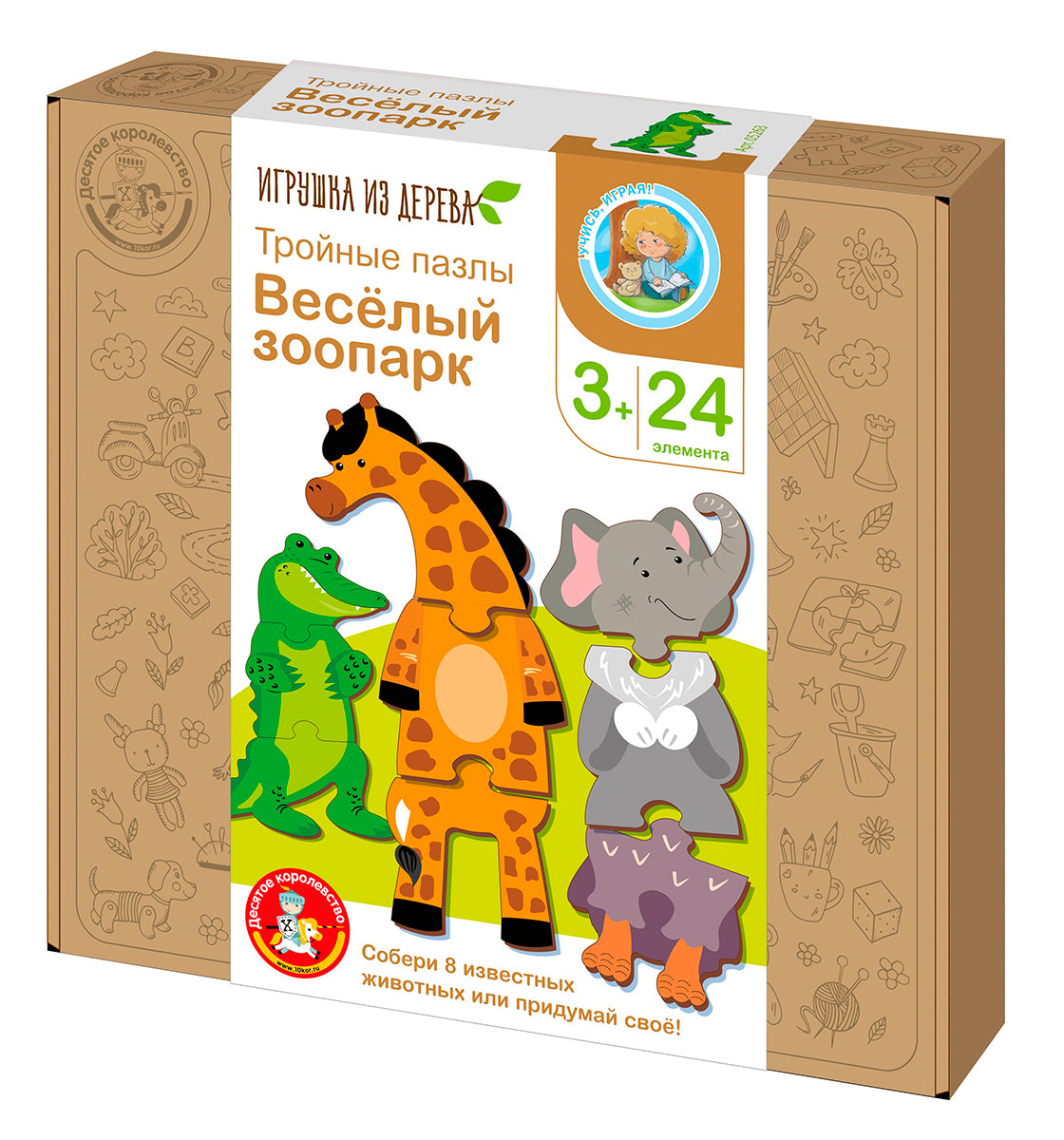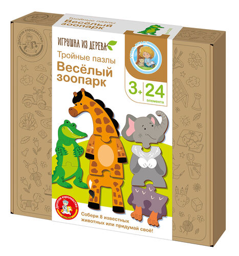 Пазлы из дерева. Тройные пазлы "Веселый зоопарк" 24 эл. Состав игры: 8 пазлов из древесного материала из 3-х элементов каждый.Размер каждого пазла 6х13 см.Деревянный материал, картон. Игры создаются для детей старше 3 лет.