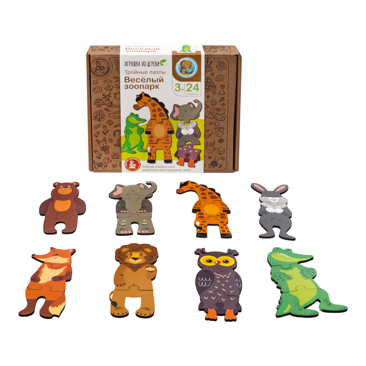 Пазлы из дерева. Тройные пазлы "Веселый зоопарк" 24 эл.