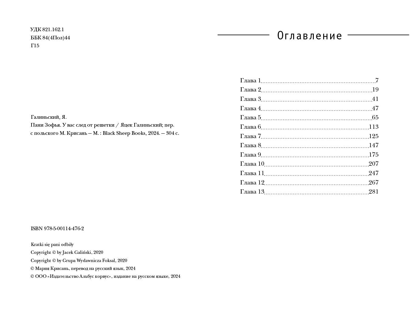 Третья книга из серии юмористических детективов Яцека Галиньского. В погоне за правдой неутомимая пани Зофья попадает за решетку. Опустить руки и сдаться? Нет, это не про неё! Даже в тюрьме она ведет расследование, а еще узнает тонкости жизни в заключении, заводит подруг, совершает побег и даже почти устраивает международный скандал с участием делегации ЕС и трусов.ISBN 978-5-00114-476-22024304 с.135 × 206 мм3000 экз.18+Об авторе:Яцек Галиньский — польский писатель, автор нашумевших ироничных детективов, сценарист. Окончил Варшавскую киношколу и факультет экономических наук Варшавского университета. Победитель конкурса рассказов, приуроченного к Международному фестивалю детективной фантастики во Вроцлаве в 2019, обладатель титула «Литературный мошенник», лауреат фестиваля детективных историй в Варшаве.В 2019 году Яцек Галиньский написал свою дебютную книгу из серии про пани Зофью «У вас колесо отвалилось». В серии вышло пять книг.О серии "Пани Зофья":Серия юмористических криминальных детективов про пани Зофью Станецкую состоит из пяти книг. Главная героиня раздражает, ее насмешки порой жестоки. Однако по ходу книги читатель проникается к ней уважением и сочувствием: пани Зофья — маленький человек, почти невидимка — в одиночку противостоит преступному миру. А ее сообразительности и острому языку можно только позавидовать. Чем не новая мисс Марпл?