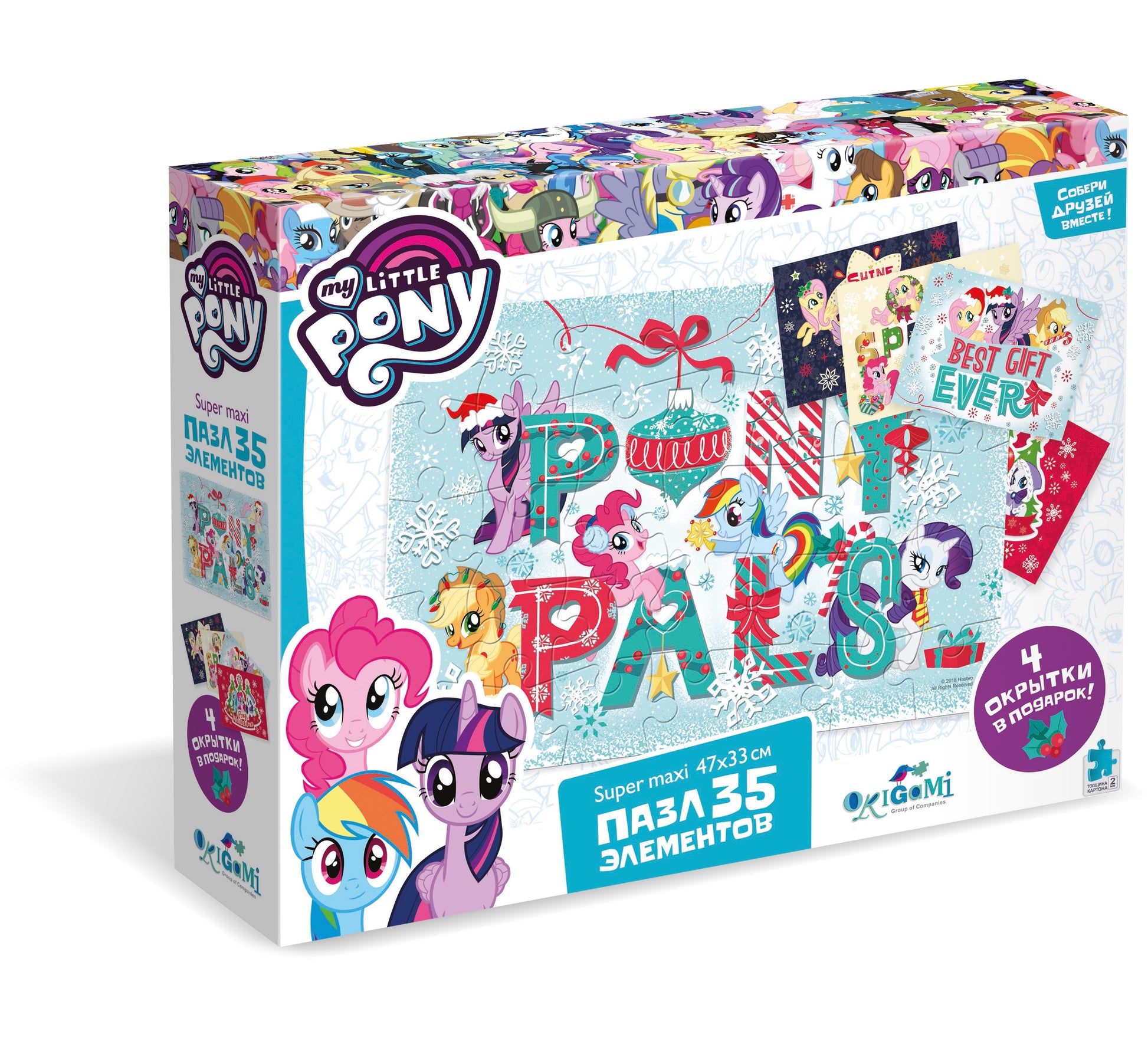 Handling time: 14 days В волшебной стране Эквестрии наконец-то наступила зима, а значит, пришла пора весёлых зимних забав! А ещё впереди самый лучший зимний праздник - Новый год! Встречай его вместе со своими любимыми героями и никогда не забывай о том, что дружба - это чудо! Собери большой пазл с милыми пони и получи в подарок 4 красивые открытки! Немного фантазии - и незабываемый мир магии распахнёт перед тобой свои чудесные двери!Количество деталей пазла: 35Размер собранного пазла: 47х33 см.Изготовлено из бумаги, картона.Для детей от 3-х лет.Не рекомендуется детям до 3-х лет. Содержит мелкие детали.Сделано в России.