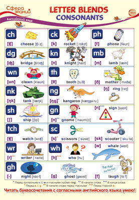 Сочетание букв: Согласные (Буквосочетания: согласные)Плакат предпочтителен для занятий по английскому языку с учащимися 2-х классов общеобразовательных организаций. Соответствует ФГОС начального общего образования по учебному предмету «Английский язык». В каждом случае приводятся примеры слов с буквосочетанием, его транскрипцией и картинкой-переводом. Пособие поможет школьникам научиться читать по-английски, правильно произносить и записывать слова.Плакат незабываемый, привлекающий к себе внимание ребенка. Имеет удобный формат А3, его легко разместить в классе или дома для изучения предложенного материала.
