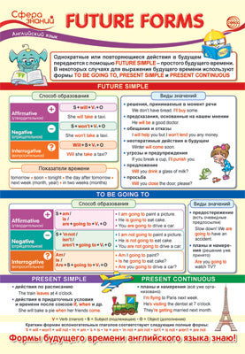 Плакат предпочтителен для занятий по английскому языку с учащимися 4-х классов общеобразовательных организаций. Соответствует ФГОС начального общего образования по учебному предмету «Английский язык». Плакат посвящен такой грамматической категории английского языка, как будущее. В нем представлены времена и конструкции, формы которых передают различные виды каких-либо действий в будущем: будущее простое, быть собирающимся, настоящее простое, настоящее длительное. Рассматриваются формы образования будущего времени, в которых используются показатели времени, при этом принципы приводятся в устной форме. Для отдельных форм предлагается схема построения различных типов предложений: условного, отрицательного, вопросительного. Плакат представляет собой яркое наглядное пособие, привлекающее внимание ребенка, имеющее удобный формат А3, его легко прикрепить в классе или дома для изучения предложенного. материал.