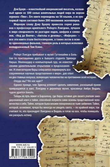 Handling time: 14 days Новый роман от автора абсолютного бестселлера "Код да Винчи"! Продолжение романов "Ангелы и демоны", "Код Да Винчи", "Утраченный символ" и "Инферно". Профессор Роберт Лэнгдон начинает новое расследование! Во всем мире продано свыше 200 000 000 книг Дэна Брауна! Роберт Лэнгдон прибывает в музей Гуггенхайма в Бильбао по приглашению друга и бывшего студента Эдмонда Кирша. Миллиардер и компьютерный гуру, он известен своими удивительными открытиями и предсказаниями. И этим вечером Кирш собирается "перевернуть все современные научные представления о мире", дав ответ на два главных вопроса, волнующих человечество на протяжении всей истории: Откуда мы? Что нас ждет? Однако прежде чем Эдмонд успевает сделать заявление, роскошный прием превращается в хаос. Лэнгдону и директору музея, красавице Амбре Видаль, чудом удается бежать. Теперь их путь лежит в Барселону, где Кирш оставил для своего учителя закодированный ключ к тайне, способной потрясти сами основы представлений человечества о себе. Тайне, которая была веками похоронена во тьме забвения. Тайне, которой, возможно, лучше бы никогда не увидеть света, - по крайней мере, так считают те, кто преследует Лэнгдона и Видаль и готов на все, чтобы помешать им раскрыть истину. Об автореДэн Браун - известнейший американский писатель, названный одним из 100 самых влиятельных людей мира по версии журнала "Time". Его книги переведены на 56 языков, а их суммарный тираж составил более 200 миллионов экземпляров.Мировую славу Дэну Брауну принесла серия романов о профессоре-криптологе Роберте Лэнгдоне, лучшем в мире специалисте по разгадке кодов, шифров и символов. "Код да Винчи", "Ангелы и демоны", "Инферно" - все эти книги стали бестселлерами №1, а также легли в основу одноименных фильмов, главную роль в которых исполнил неподражаемый Том Хэнкс.