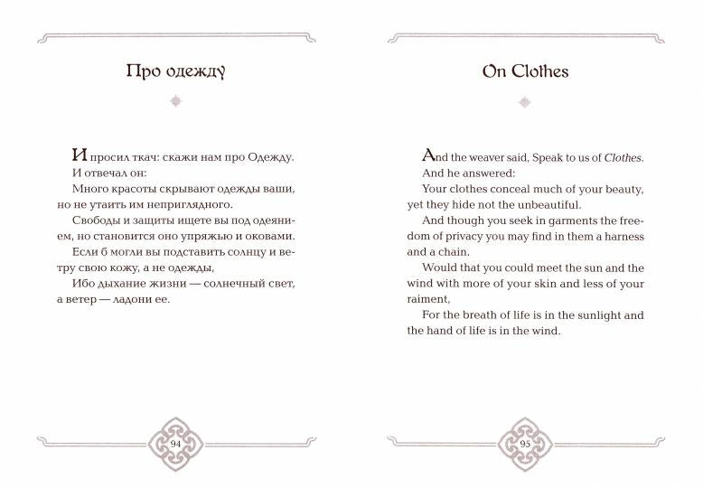 Handling time: 19 days Мировая классика, одна из самых популярных книг в мире на протяжении вот уже целого века. Книга-билингва публикуется с авторскими иллюстрациями, вошедшими в первое издание 1923 года. Новый перевод на русский язык. собрание невероятно красивых притч, обращенных к каждому и указывающих пути обретения духовной гармонии. Что такое любовь? Что такое свобода? Как отличить добро от зла? Существуют ли дружба и красота? Почему так важна молитва? Кажется, нет такого философского вопроса, который не задали бы жители города Орфалеза мудрому Пророку Аль-Мустафе и на который он бы не ответил развернуто и поэтично. Пять причин купить 1Подарочное издание в шикарной суперобложке с великолепными иллюстрациями самого Джебрана. 2Новый перевод, бережно относящийся к тексту оригинала, но в то же время более адаптированной для современного читателя. 3Книга на двух языках, позволяющая сравнить оригинал на английском и перевод. 4Автор говорит о вечных истинах, его притчи читаются актуально, современно и неизменно вызывают эмоциональный отклик. 5Книга подойдет для адептов всех религиозных конфессий, для эзотериков и тех, кто просто любит хорошую литературу.