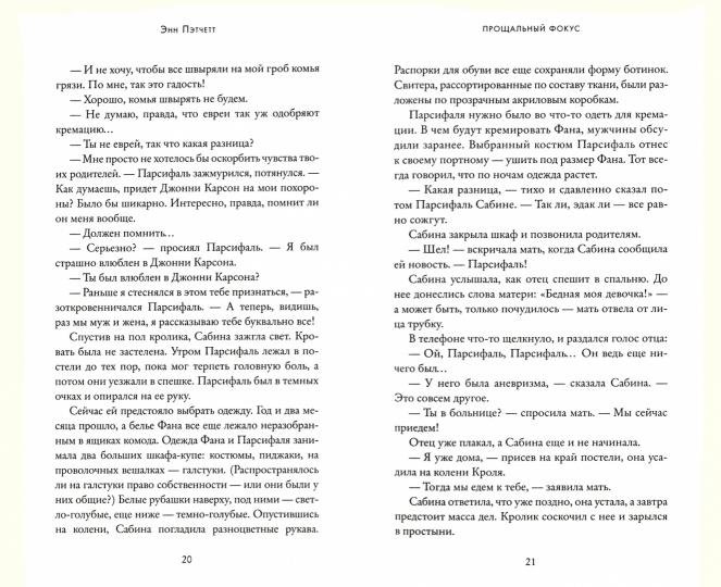 Handling time: 19 days Иллюзии и превращения были частью жизни Сабины. Как ассистентка известного фокусника она знала, откуда в шляпе появляется кролик, умела исчезать на глазах у зрителей и мило улыбаться, будучи распиливаемой на части. Как его жена она полагала, что хорошо знает человека, с которым состоит в браке…Однако после внезапной смерти Парсифаля оказалось, что свой самый сложный фокус он исполнил не на сцене, а в жизни: выяснилось, что он жил под чужим именем, а его семья, якобы погибшая в результате трагического несчастного случая, на самом деле жива… Пять причин купить 1Энн Пэтчетт — один из самых крупных американских писателей наших дней, автор восьми романов, обладательница ряда престижных литературных наград. 2Запутанная семейная драма, которая оборачивается историей любви и прощения. 3Повествование, органично переплетающее сон и явь, воспоминания и реальные события. 4Возможность заглянуть в «закулисье» иллюзиониста и даже узнать о секретах некоторых фокусов. 5Почувствовать атмосферу жизни в Лос-Анджелесе и в небольшом городе в Небраске.