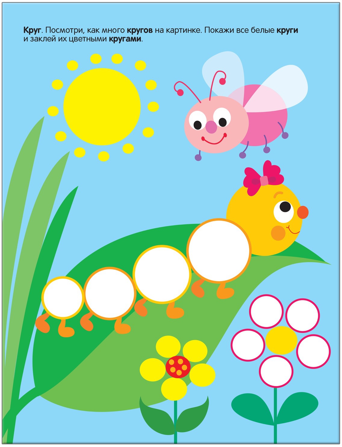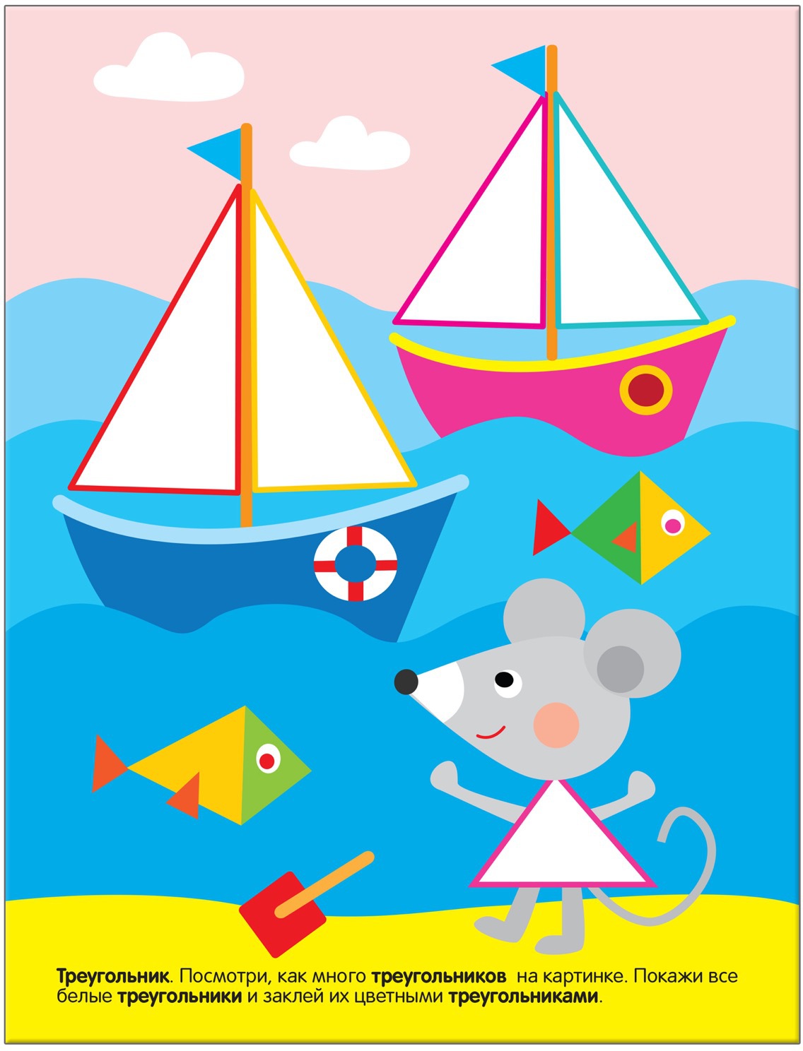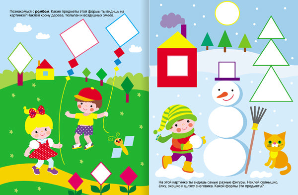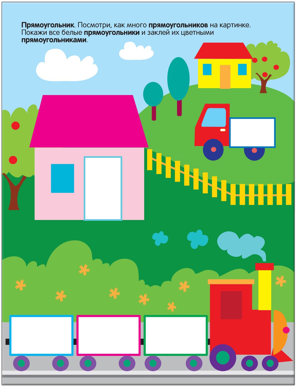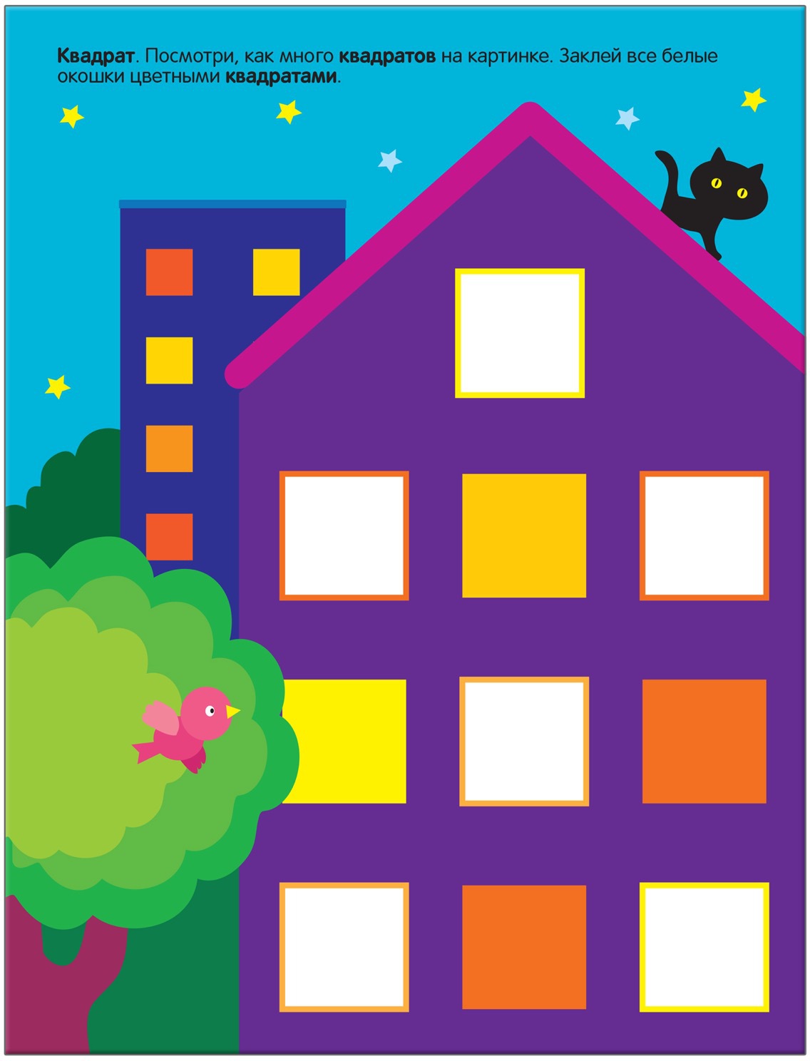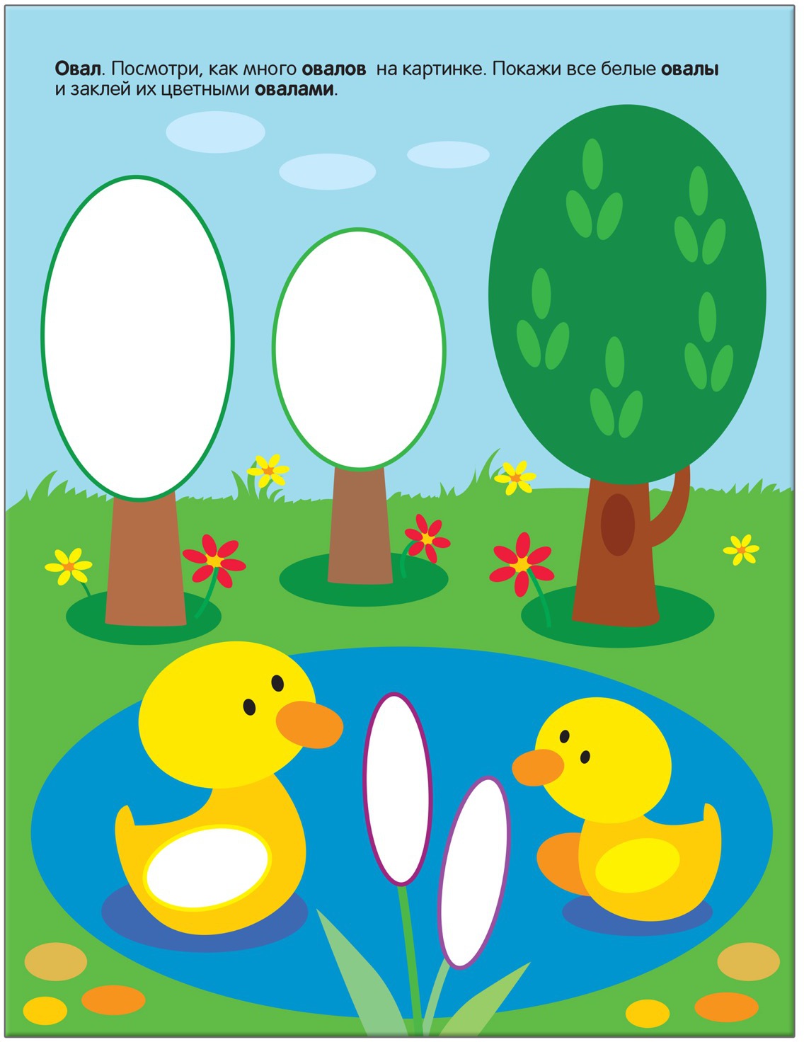 С помощью этой книги малыш познакомится с основными геометрическими формами, научится различать и называть их (в домик нужно наклеить квадратные окошки; возле озера с утятами – овальные кроны деревьев и камыш и т. д.).
