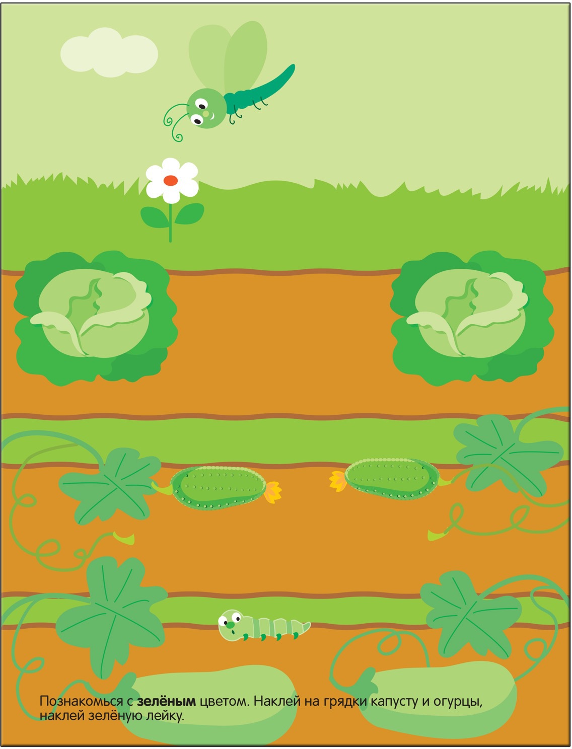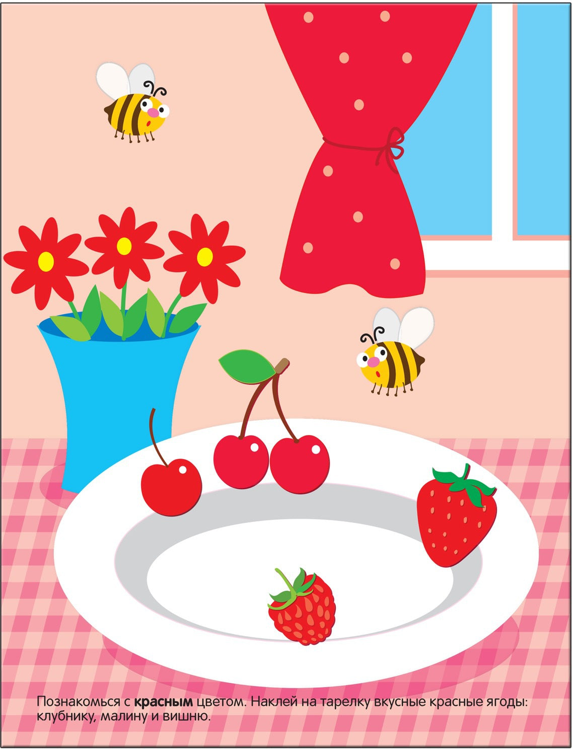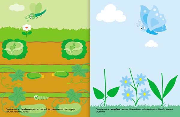 С помощью этой книги малыш познакомится с основными цветами, научиться различать и называть их (на тарелку нужно наклеить красные ягоды: клубнику, малину, вишню; на грядки – зелёные огурцы и капусту и т. д.).
