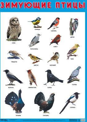 Плакат большого формата «Зимующие птицы» познакомит детей с птицами, которые с наступлением холодов не улетают в теплые страны, а остаются зимовать на территории нашей страны. Четкие, яркие фотографии обязательно заинтересуют ребят и помогут быстро выучить названия птиц. Наглядный материал может быть использован на занятиях по ознакомлению с окружающим миром, для развития речи и мышления.