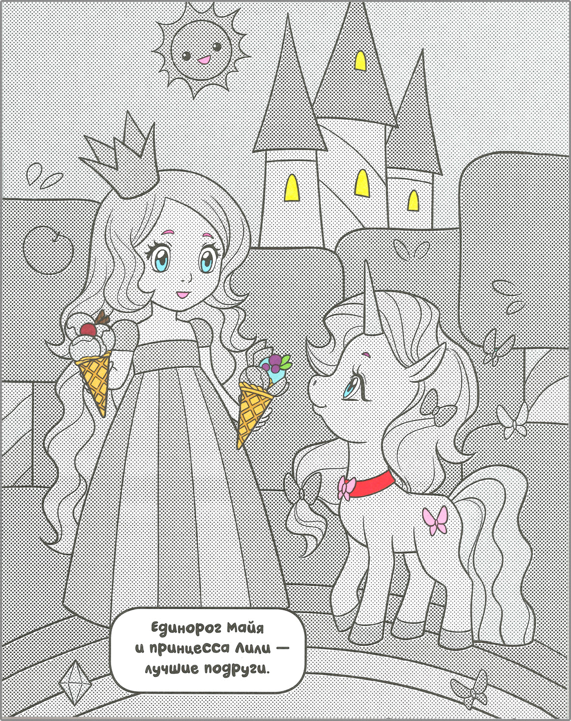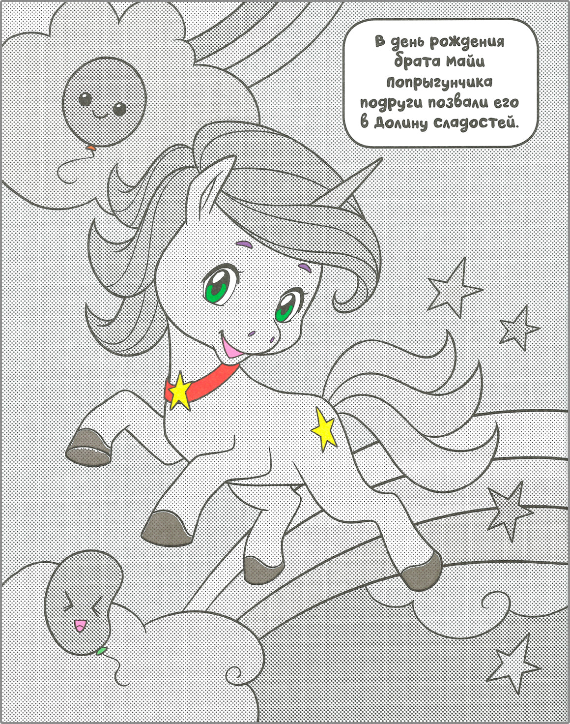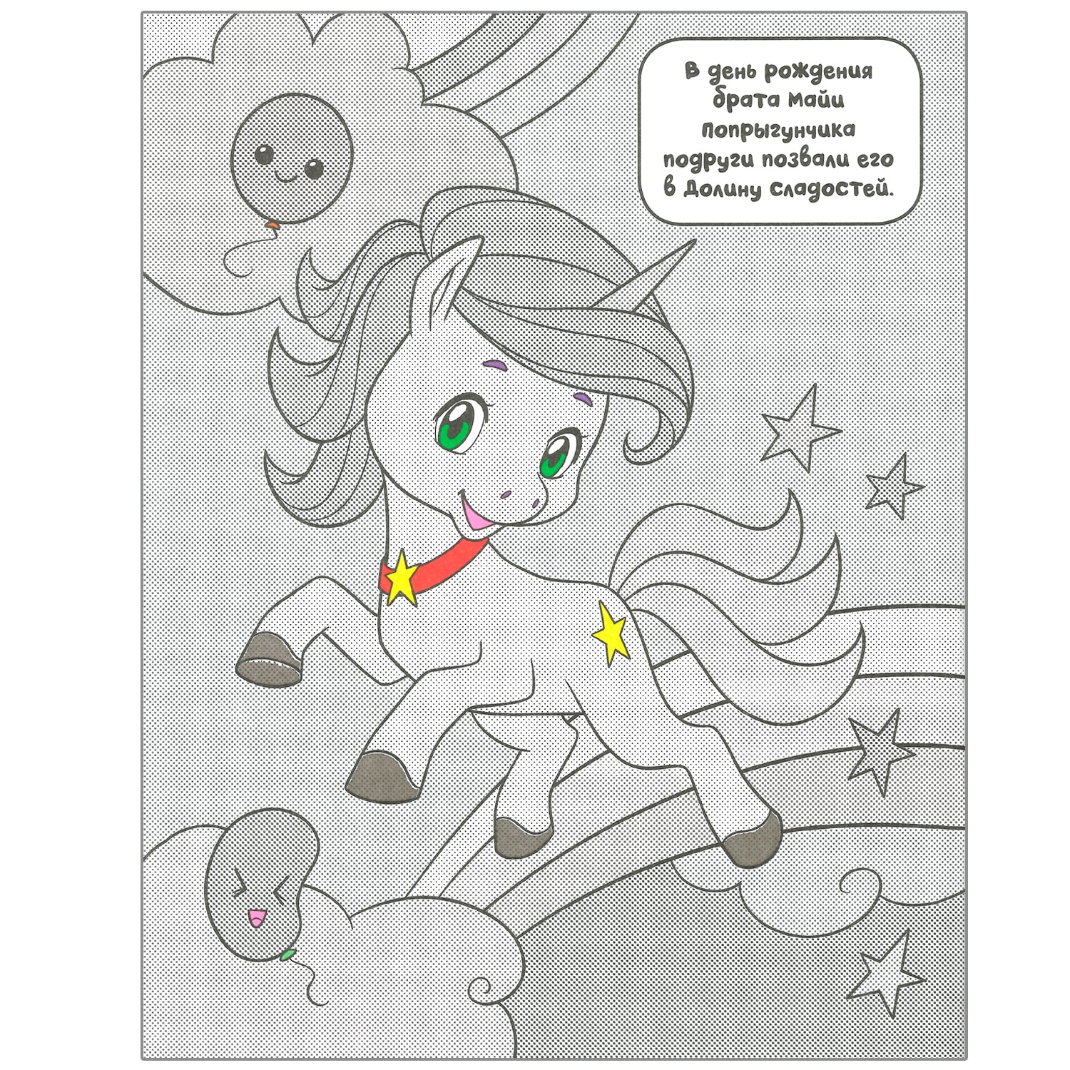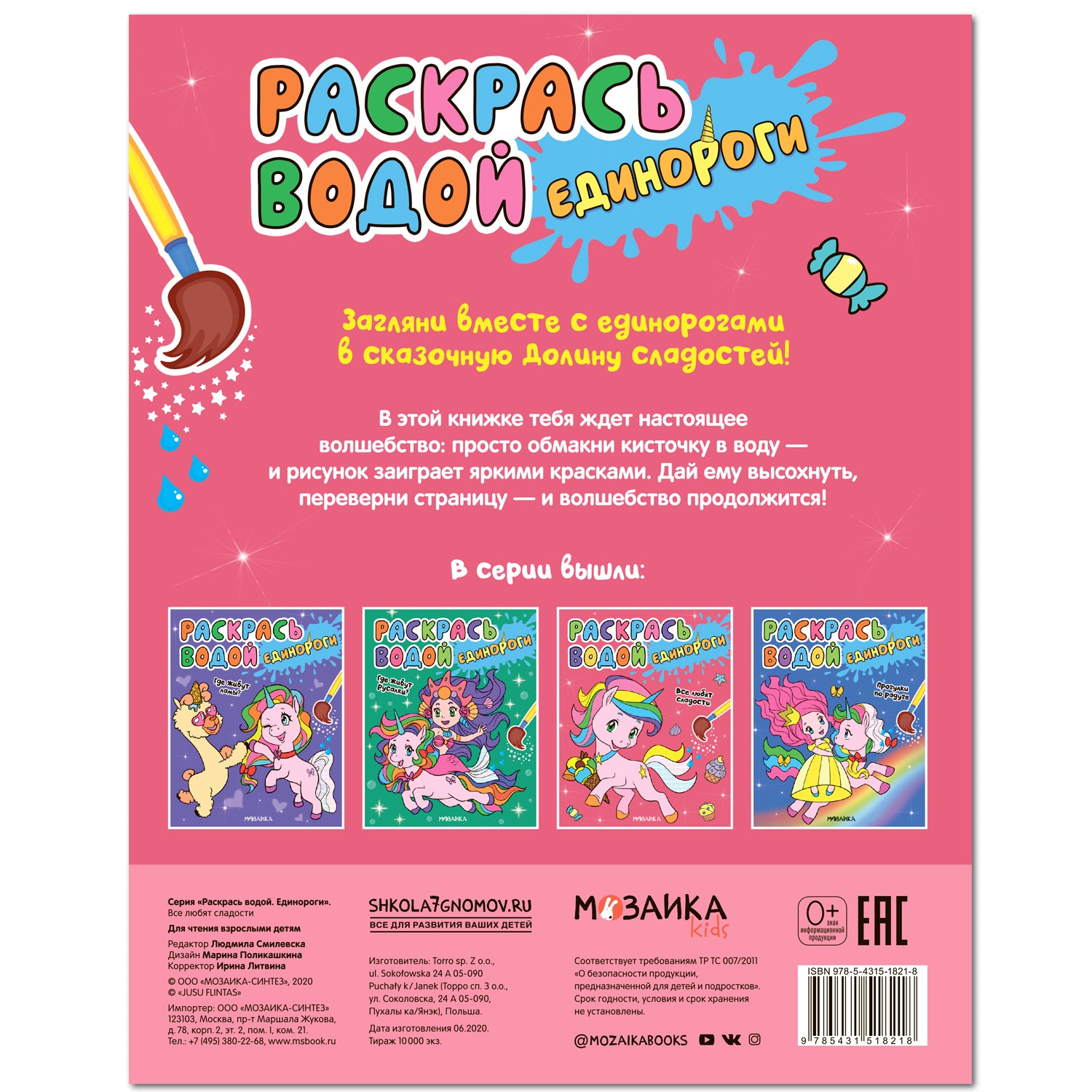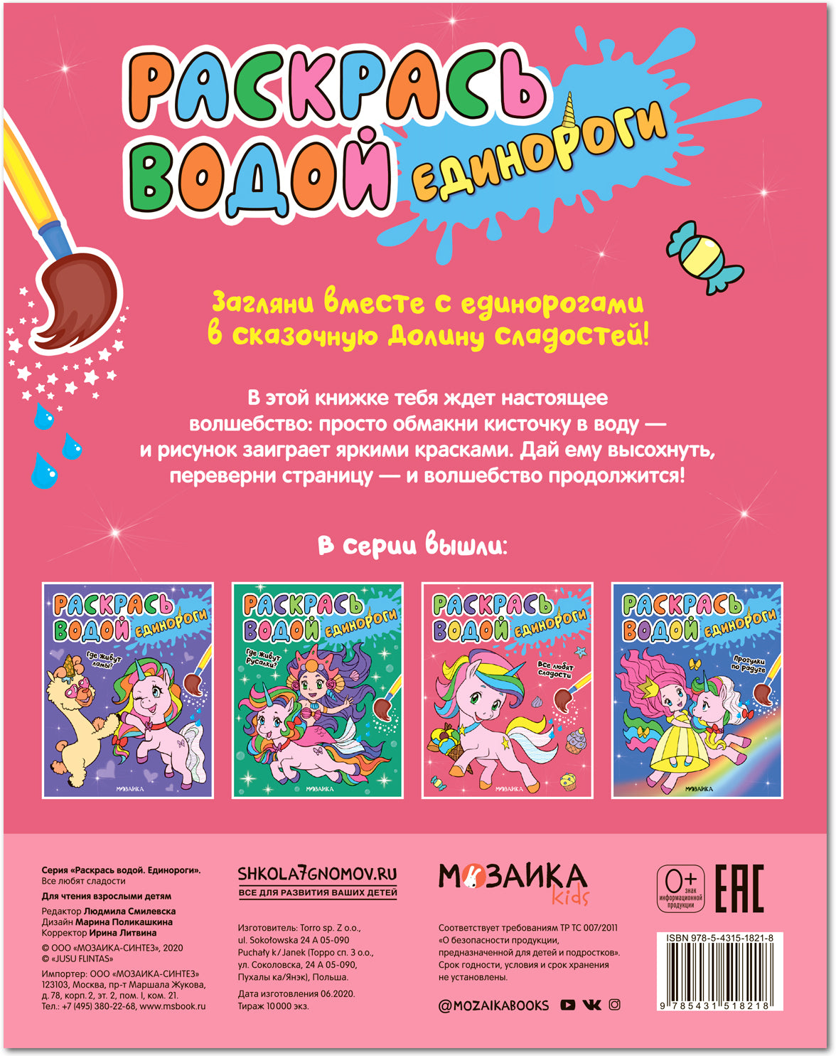 Все любят сладости (Раскрась водой. Единороги ) Раскраска «Все любят сладости» из серии «Раскрась водой. Единороги» — это волшебная водная раскраска для самых маленьких художников. Для работы с ней понадобится только кисточка и вода: проведите влажной кисточкой по странице — и рисунок заиграет яркими красками! Дайте раскрашенной страничке высохнуть, переверните ее — и волшебство продолжится. Познакомьтесь с жителями Сказочной страны — единорогами, и отправляйтесь вместе с ними в увлекательное путешествие в Долину сладостей. Читайте историю, раскрашивайте...