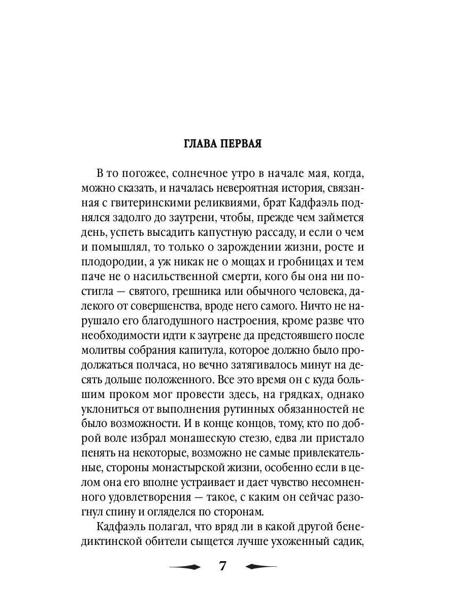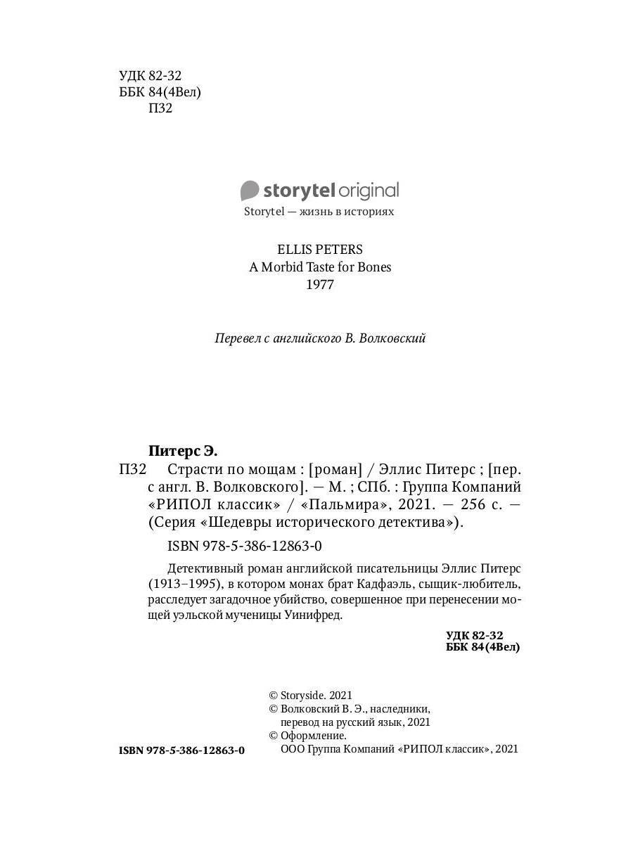 Handling time: 25 days Автор: Питерс Эллис, «Страсти по мощам»: Детективный роман английской писательницы Эллис Питерс (1913–1995), в котором монах брат Кадфаэль, сыщик-любитель, расследует загадочное убийство, совершенное при перенесении мощей уэльской мученицы Уинифред.