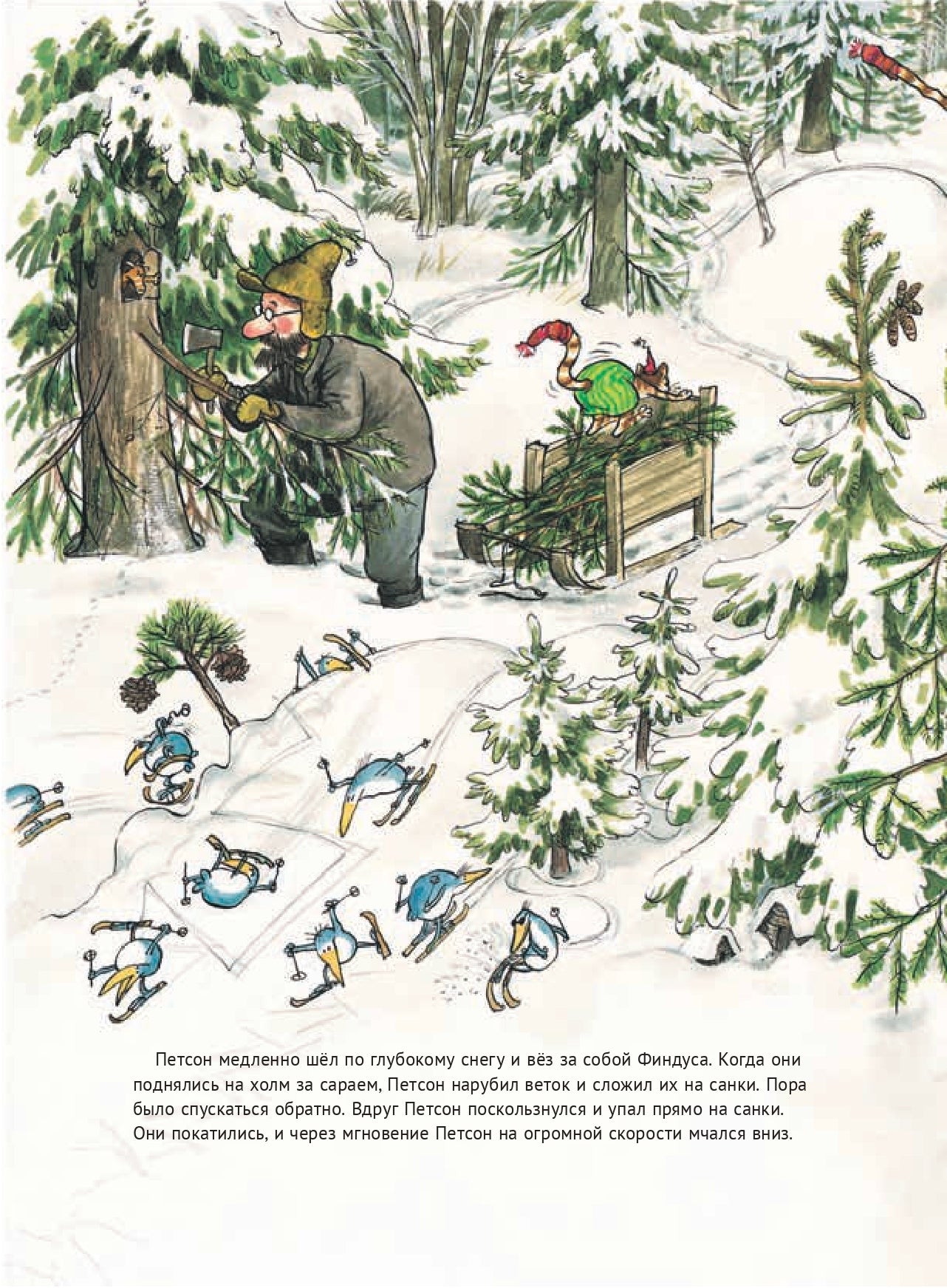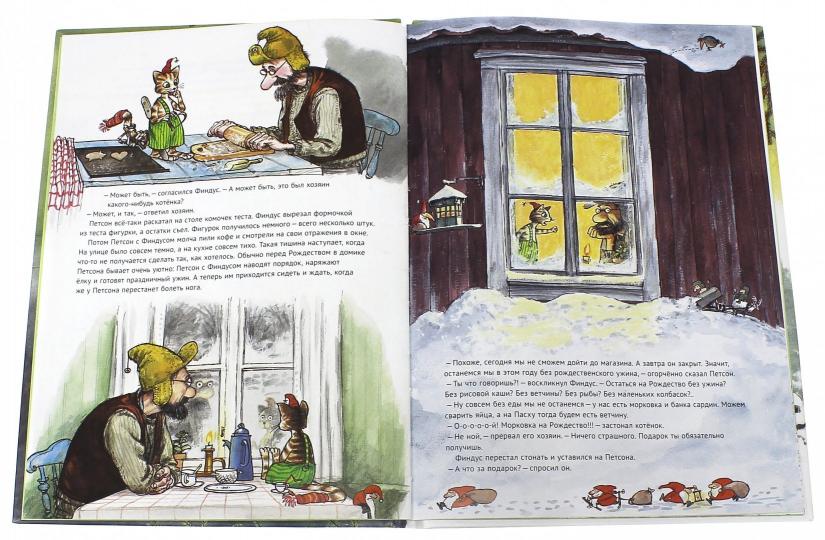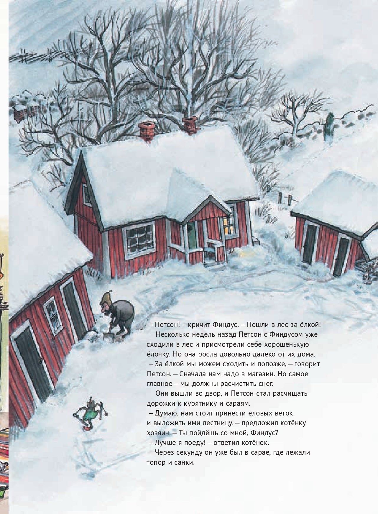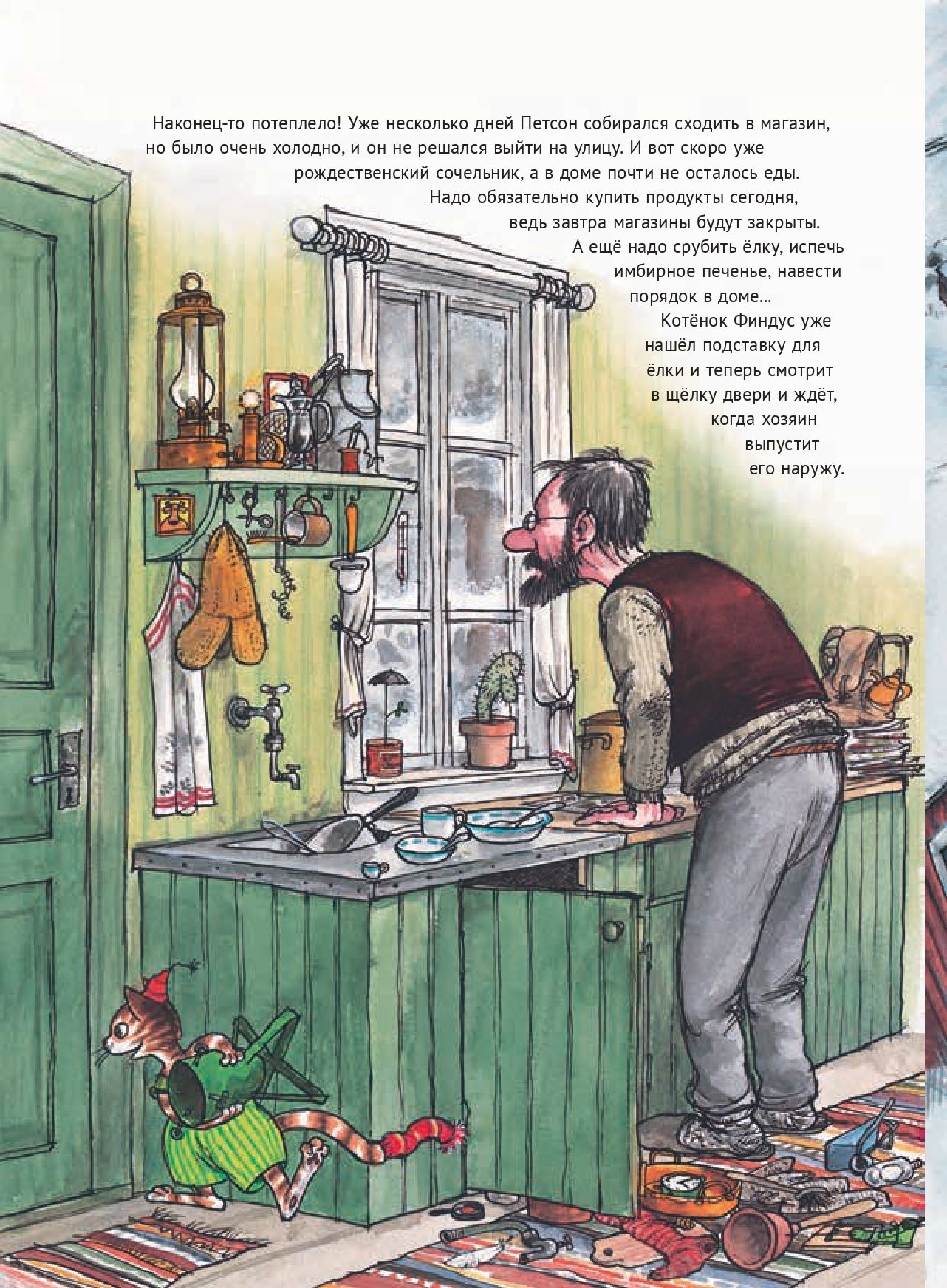 · Из книги можно узнать, как самому сделать новогоднюю елку из палки и еловых веток.Для кого:Для чтения взрослыми детям в возрасте от 5 лет.О серии:Серия книг про старика Петсона и его друга-котенка Финдуса, живущих в деревне, была придумана шведским художником Свеном Нурдквистом в 1984 году. С тех пор об этих героях узнал весь мир: книги переведены на множество языков.Книги о Петсоне и Финдусе стали новой детской классикой. По ним ставят спектакли, делают компьютерные игры, приложения, раскраски, календари и подарочные наборы. На них выросло не одно поколение детей в Швеции и России.Отзыв критика:Я влюбилась в Нурдквиста именно за его иллюстрации, смешные и трогательные. Они возвращают напрямую в наше собственное детство: помните, как это — лечь в траву и представить себя маленькой, живущей в травяном лесу? Все листья, жучки и муравьи оказываются соразмерны тебе, и столько всего открывается в этом крохотном мире! Примерно это и происходит, когда смотришь иллюстрации Нурдквиста — каждая страница являет собой такой мирок. Кроме главных действующих героев, которые очень характерны, буквально каждая букашка, каждый цветок живет своей жизнью и тоже имеет характер. Екатерина Голубева. «Папмамбук»Об авторе:Свен Нурдквист родился в городе Хельсингборге. Уже в пятнадцать лет он знал, что будет художником. Поэтому, учась на архитектора, он одновременно ходил на курсы по искусству и рисованию. Поначалу Свен Нурдквист создавал иллюстрации к школьным учебникам. А от учебников недалеко и до детских книг. Работы Нурдквиста участвуют во многих международных выставках.