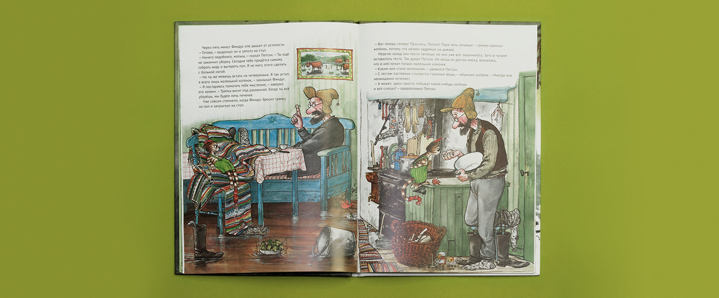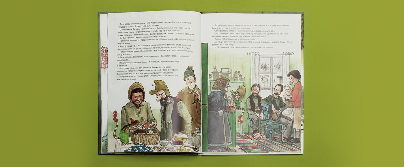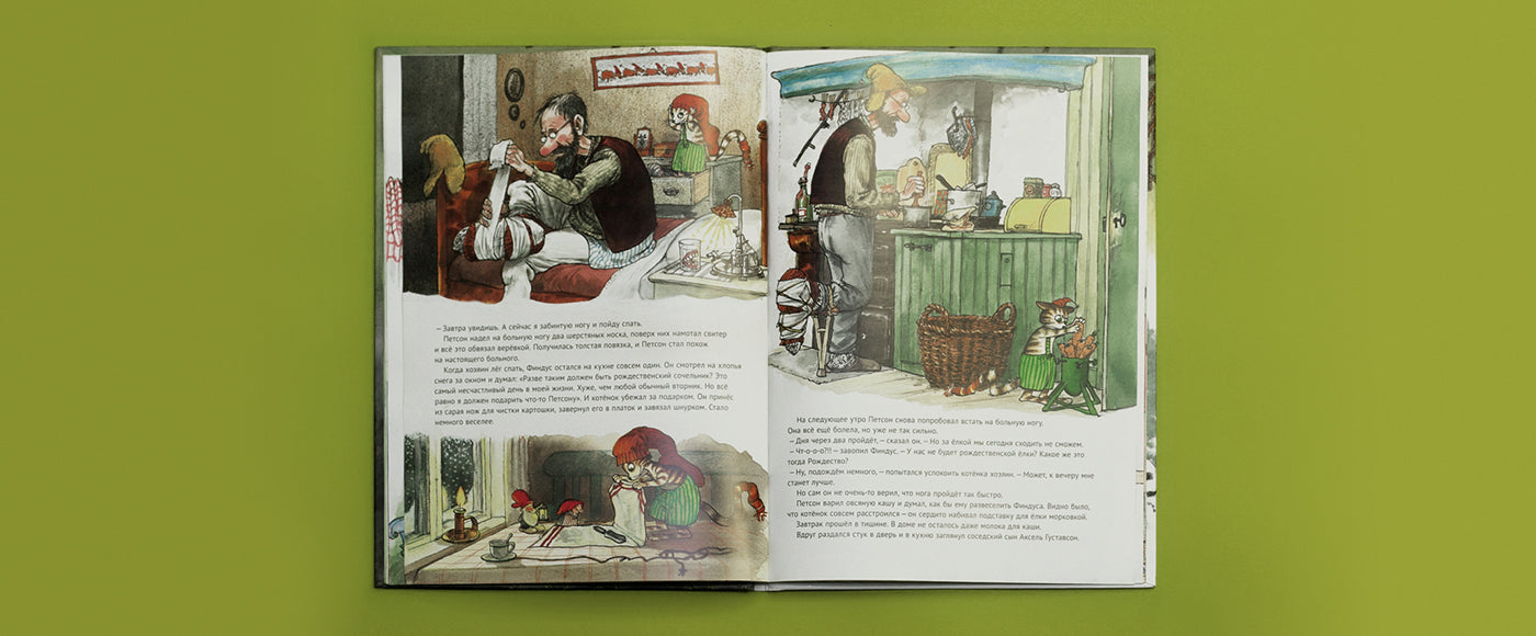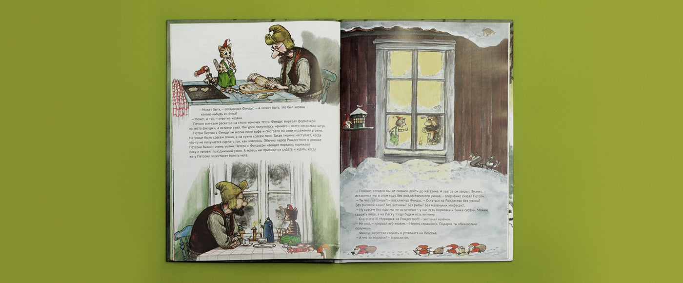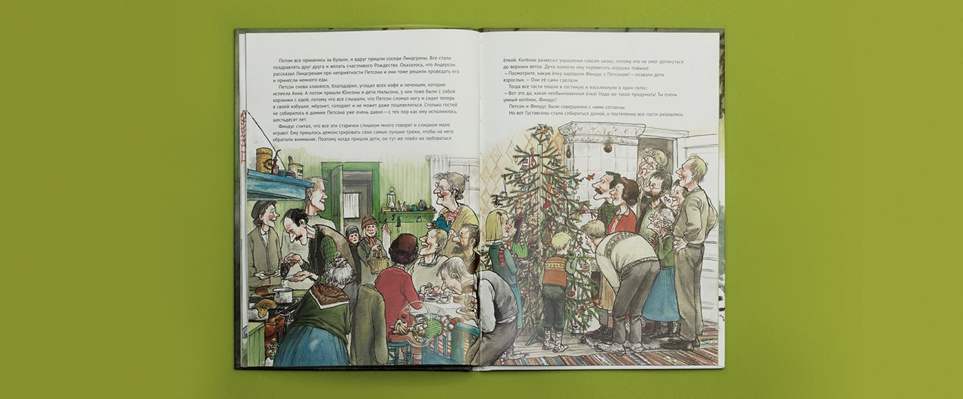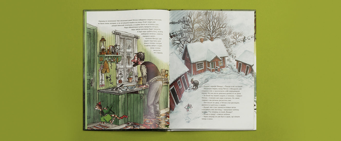 · Из книги можно узнать, как самому сделать новогоднюю елку из палки и еловых веток.Для кого:Для чтения взрослыми детям в возрасте от 5 лет.О серии:Серия книг про старика Петсона и его друга-котенка Финдуса, живущих в деревне, была придумана шведским художником Свеном Нурдквистом в 1984 году. С тех пор об этих героях узнал весь мир: книги переведены на множество языков.Книги о Петсоне и Финдусе стали новой детской классикой. По ним ставят спектакли, делают компьютерные игры, приложения, раскраски, календари и подарочные наборы. На них выросло не одно поколение детей в Швеции и России.Отзыв критика:Я влюбилась в Нурдквиста именно за его иллюстрации, смешные и трогательные. Они возвращают напрямую в наше собственное детство: помните, как это — лечь в траву и представить себя маленькой, живущей в травяном лесу? Все листья, жучки и муравьи оказываются соразмерны тебе, и столько всего открывается в этом крохотном мире! Примерно это и происходит, когда смотришь иллюстрации Нурдквиста — каждая страница являет собой такой мирок. Кроме главных действующих героев, которые очень характерны, буквально каждая букашка, каждый цветок живет своей жизнью и тоже имеет характер. Екатерина Голубева. «Папмамбук»Об авторе:Свен Нурдквист родился в городе Хельсингборге. Уже в пятнадцать лет он знал, что будет художником. Поэтому, учась на архитектора, он одновременно ходил на курсы по искусству и рисованию. Поначалу Свен Нурдквист создавал иллюстрации к школьным учебникам. А от учебников недалеко и до детских книг. Работы Нурдквиста участвуют во многих международных выставках.