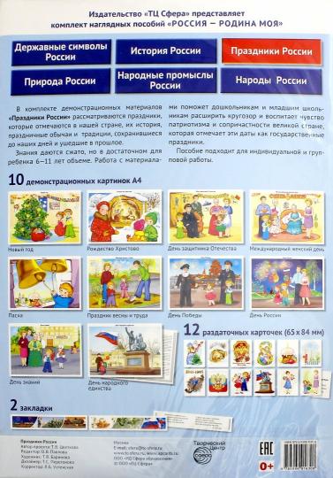 В демонстрационных материалах «Праздники России» рассматриваются праздники, которые отмечаются в нашей стране, ее истории, праздничных обычаях и традициях, сохранившихся до наших дней и ушедших в прошлое. Задания выполняются осторожно, но достаточно для детей 6-11 лет. Работа с материалами помогает дошкольникам и младшим школьникам расширить кругозор и воспитать чувство патриотизма и сопричастности великой страны, которая отмечает эти даты как праздники. Подходит для индивидуальной и групповой работы.Подробнее об издании см. в статьях:https://tc-sfera.ru/materials/news/detail.php?ID=29965&IBLOCK_ID=51https://tc-sfera.ru/materials/news/rossiya-rodina-moya