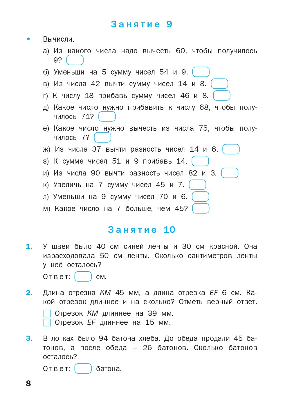Предлагаемое пособие содержит задания на отработку навыка устного счёта. Оно разработано в соответствии с требованиями ФГОС НОО и включает все виды примеров и задач для 3 класса.Предназначено для учащихся и учителей начальных классов, а также для занятий с детьми дома.РЕКОМЕНДУЕМ: Тренажёр по математике. 3 класс Цена: 212.00 руб. шт. Автор(ы): Яценко И.Ф.Количество страниц: 80ISBN: 978-5-408-04512-9Формат: 70х100/16 (165x235 мм)Переплет: обложкаСодержание Предисловие Числа от 1 до 100. Сложение и вычитание. Повторение Занятия 1–3. Повторение. Нумерация чисел. Приёмы сложения и вычитания Занятие 4. Выражения с переменной Занятия 5–7. Решение уравнений Занятие 8. Обозначение геометрических фигур буквами Занятия 9, 10. Закрепление изученного по теме «Числа от 1 до 100. Сложение и вычитание» Числа от 1 до 100. Табличное умножение и деление Занятия 11, 12. Связь умножения и сложения Занятия 13, 14. Связь между компонентами и результатами умножения Занятие 15. Чётные и нечётные числа Занятие 16. Таблица умножения и деления с числом 3 Занятие 17. Решение задач с величинами «цена, количество, стоимость» Занятие 18. Решение задач с понятиями «масса, количество» Занятия 19, 20. Порядок выполнения действий Занятия 21, 22. Таблица умножения и деления с числом 4 Занятия 23–25. Закрепление изученного Занятия 26–30. Задачи на увеличение и уменьшение числа в несколько раз Занятия 31, 32. Таблица умножения и деления с числом 5 Занятия 33, 34. Задачи на кратное сравнение Занятие 35. Таблица умножения и деления с числом 6 Занятия 36–38. Решение задач Занятия 39, 40. Таблица умножения и деления с числом 7 Занятия 41–45. Закрепление изученного Занятие 46. Площадь. Сравнение площадей фигур Занятие 47. Квадратный сантиметр Занятие 48. Площадь многоугольника Занятие 49. Площадь прямоугольника Занятия 50, 51. Таблица умножения и деления с числом 8 Занятие 52. Закрепление изученного. Решение задач Занятие 53. Таблица умножения и деления с числом 9 Занятие 54. Квадратный дециметр Занятия 55–57. Таблица умножения. Закрепление изученного Занятие 58. Закрепление изученного Занятие 59. Квадратный метр Занятие 60. Закрепление изученного Занятие 61. Решение задач Занятия 62, 63. Закрепление изученного по теме «Табличное умножение и деление» Занятия 64, 65. Умножение на 1. Умножение на 0 Занятие 66. Деление нуля на число Занятие 67. Закрепление изученного. Решение задач Занятия 68–70. Закрепление по теме «Табличное умножение и деление. Умножение и деление с числами 1, 0. Деление нуля на число» Занятие 71. Доли Занятие 72. Окружность. Круг Занятия 73, 74. Диаметр окружности (круга). Решение задач Занятия 75, 76. Единицы времени. Год. Месяц. Сутки Занятия 77, 78. Закрепление изученного Внетабличное умножение и деление Занятия 79–81. Умножение и деление круглых чисел Занятие 82. Деление вида 80 : 20 Занятие 83. Умножение суммы на число Занятие 84. Закрепление изученного. Решение задач Занятия 85, 86. Умножение двузначного числа на однозначное Занятия 87, 88. Закрепление изученного Занятия 89, 90. Решение задач Занятия 91, 92. Деление суммы на число Занятия 93–96. Деление двузначного числа на однозначное Занятия 97–100. Деление двузначного числа на двузначное Занятие 101. Проверка деления Занятия 102, 103. Решение уравнений Занятия 104–108. Закрепление изученного по теме «Внетабличное умножение и деление» Занятия 109–116. Деление с остатком Занятие 117. Решение задач на деление с остатком Занятия 118–122. За