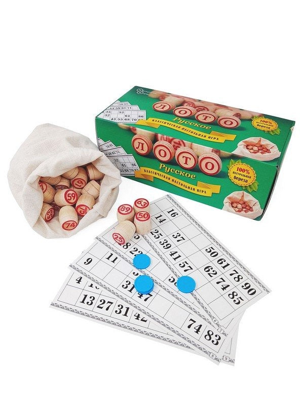 В игре использовано 90 бочонков. На каждом бочонок с двух сторон нанесен свой номер. Все бочонки кладутся в специальный непрозрачный мешок и перед началом игры тщательно перемешиваются в нем. Игровая карточка состоит из трех строк, в каждой из которых по 9 ячеек, 5 из них составляют числа. Пустые клетки для игры не показаны. Комплектация: