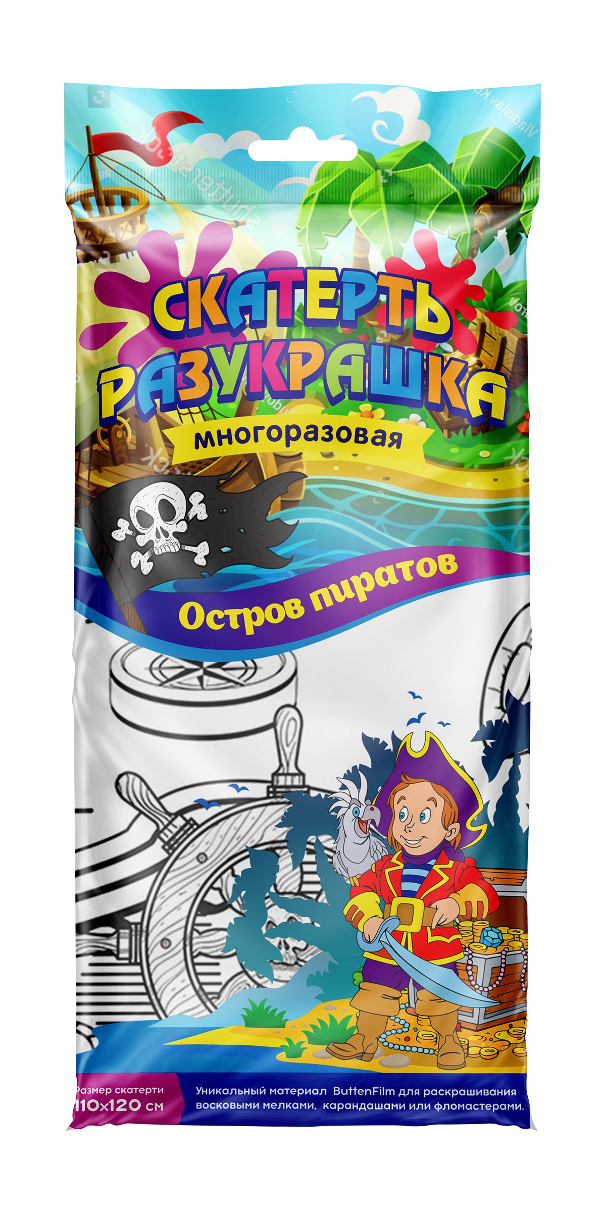 Handling time: 14 days Скатерть-разукрашка из материала ButtenFilm "Остров пиратов"- это путешествие по морским просторам в поисках сокровищ на необитаемом острове, маленькие любители приключений смогут разгадать карту сокровищ и найти сундуки полные золота и встретятся с грозой морей и океанов – кровожадными пиратами.