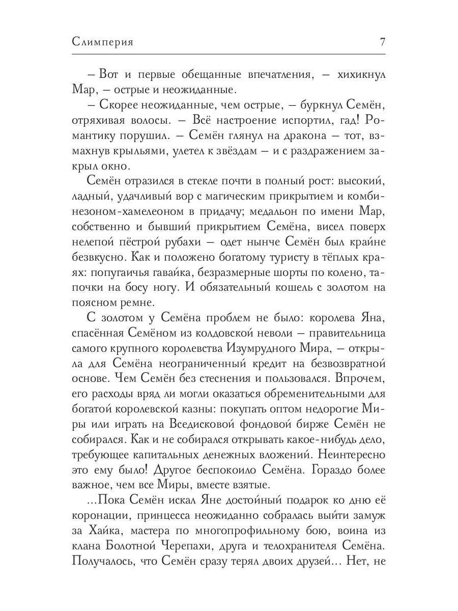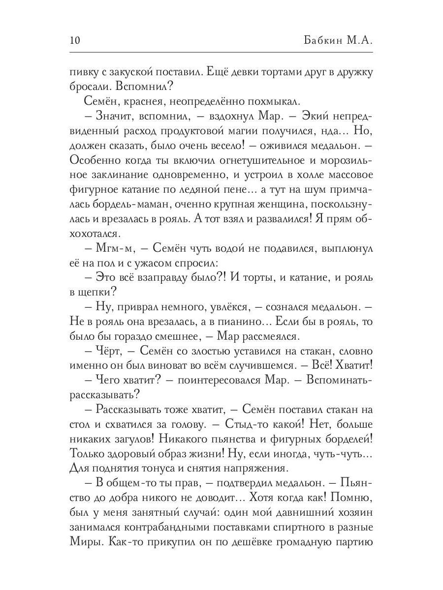 Handling time: 19 days Автор: Бабкин Михаил, «Слимперия»: Пока Семен, вор с магическим прикрытием, искал достойный подарок ко дню коронации Яны, правительницы одного из самых крупных королевств Изумрудного Мира, та внезапно решила выйти замуж за его друга и телохранителя Хайка, воина из клана Болотной Черепахи. Это повергло Семена в некоторую растерянность, перешедшую в двухнедельный загул. Хорошо, что у него есть Map, магический медальон, который вытаскивает его из нехороших ситуаций, перебрасывая из одного Мира в другой.