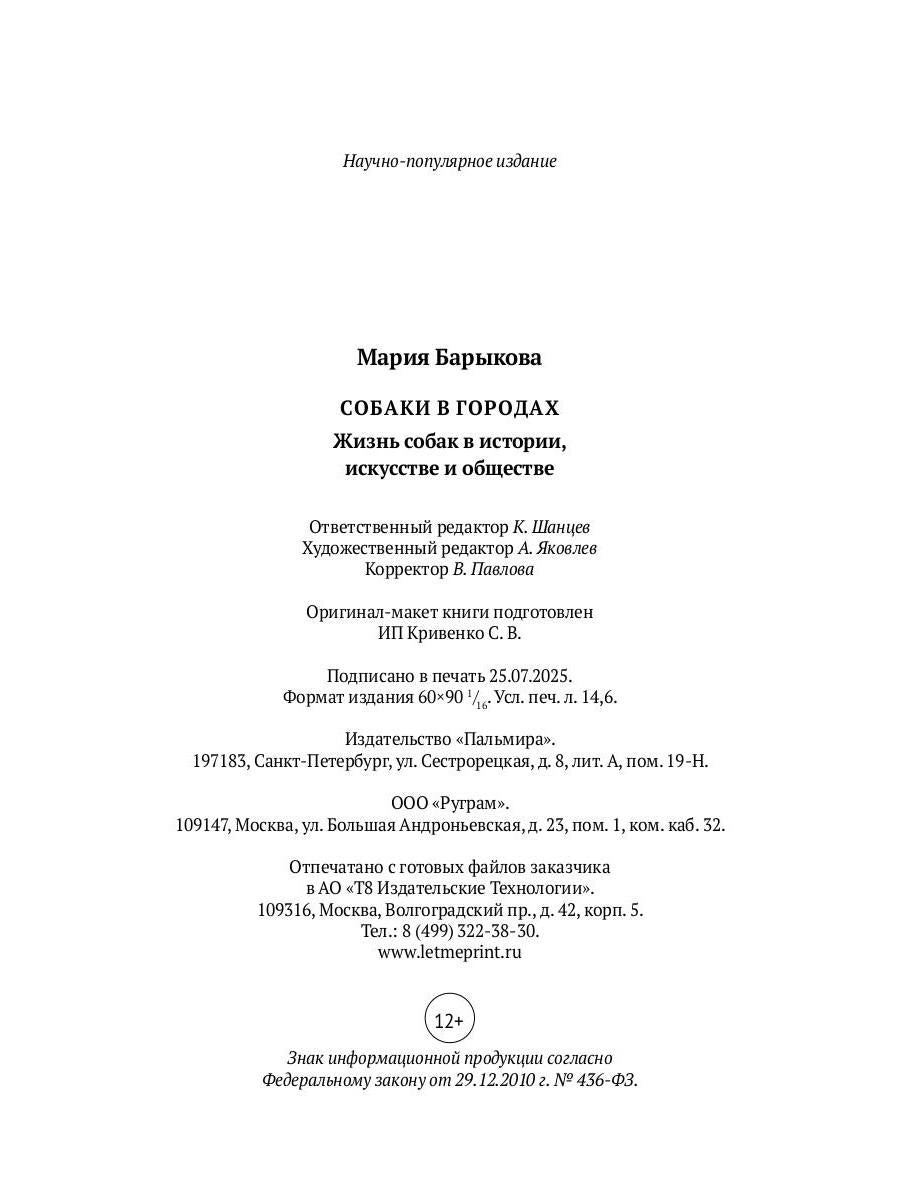 Handling time: 14 days Автор: Барыкова Мария, «Собаки в городах. Жизнь собак в истории, искусстве и обществе»: Книга «Собаки в городах» — это увлекательное и глубокое погружение в историю взаимодействия человека и собак в городском пространстве. В первой части своего исследования, «Собаки в городах», Мария Барыкова, пользуясь инструментами социологии, антропологии и философии, раскрывает взаимосвязь города, человека и собаки. А во второй и третьей частях, «Собаки в истории» и «Собаки в литературе», автор рассказывает о псах-рыцарях, четвероногих героях мировых войн, питомцах августейших особ, а также о собаках великих деятелей искусства и многих других.