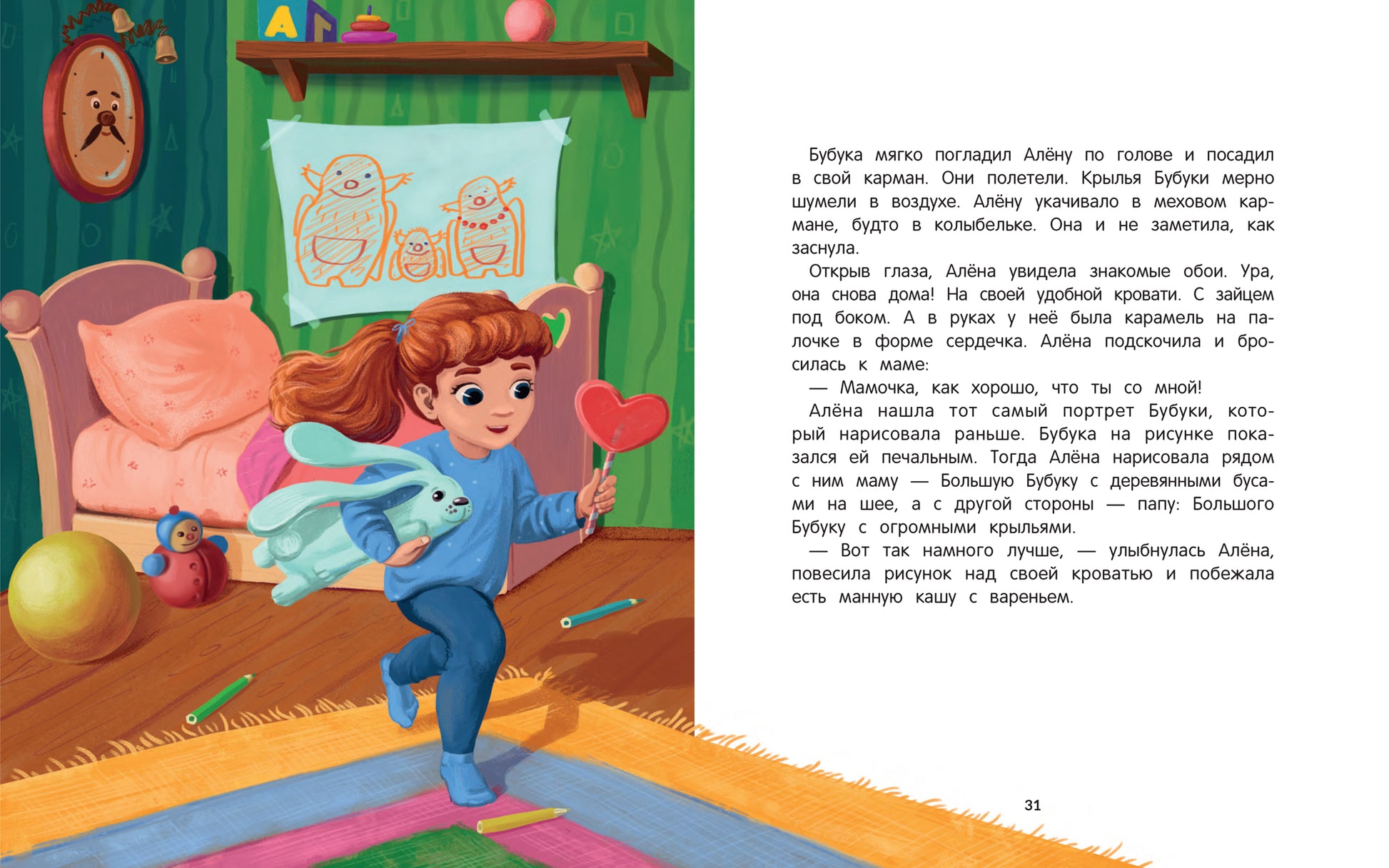 Но чудовище оказалось гостеприимным и добродушным. Бубука - так Алёна стала называть его - пытался накормить капризную гостью и поиграть с ней. Он, словно фокусник, вытаскивал из своего мехового кармана то сладости, то игрушки, то книжку. Девочка же думала только о том, как вернуться домой.