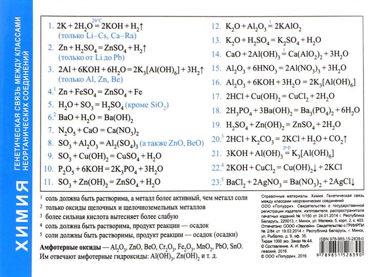 Справочные материалы: Химия. Генетическая связь между классами неорганических соединений