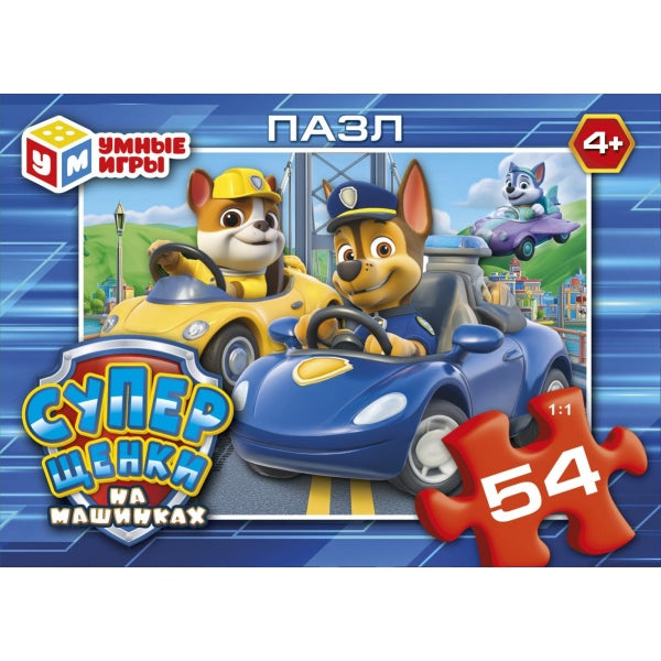 Суперщенки в машинках. Пазлы в коробке 54 детали. 90х65х25 мм. Умные игры в уп.32шт в кор.8уп