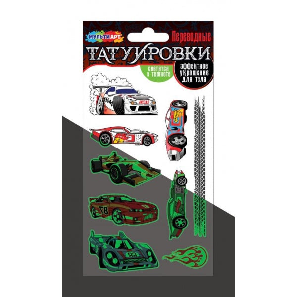Тату ГОНОЧНЫЕ МАШИНЫ, светящиеся в темноте, 1 лист, в пакете МУЛЬТИ АРТ в кор.200шт