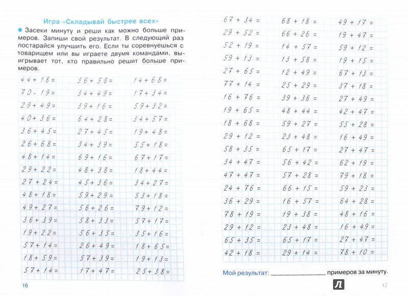Тренажёр поможет ребёнку быстро закрепить навыки сложения и вычитания в пределах 100 благодаря эффективной методике повторения материала. Задачи и упражнения разного уровня сложности чередуются с игровыми заданиями, которые можно выполнять вместе с друзьями, использовать в математических турнирах и соревнованиях. Игры поддержат интерес ребёнка к занятиям и разнообразят его досуг. Занимаясь всего 20 минут в день, ребёнок быстро улучшит вычислительные навыки, научится оценивать свою работу, самостоятельно выявлять и восполнять пробелы в знаниях.