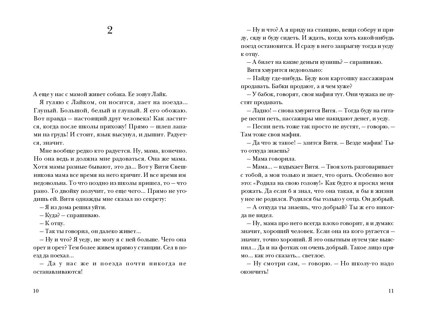 Олег живет в маленьком городе с мамой и псом Лайком. Своего отца он не знает. Подросток не очень общителен, у него есть единственный друг. А еще тайная любовь — девочка, которая однажды вышла из остановившегося на станции поезда, но с которой Олег так и не решился познакомиться. Новая встреча с этой девочкой — несбыточная мечта.Однажды Олег отправляется в Москву к маминой школьной подруге тете Жене. Внезапно он оказывается втянут в серьезную ссору тети Жени и ее мужа, не ладит с их сыном, попадает в автоаварию и даже раскрывает семейную тайну. Не слишком ли много для одного подростка? Но черная полоса закончится, и из поезда на станцию вновь выйдет та самая девочка…ü Подростковая драма с элементами романтической истории.ü Повесть о первой любви и первых ошибках.ü История о том, как дети невольно становятся жертвами нерешенных конфликтов взрослых.ü Дмитрий Сиротин — лауреат «Книгуру», Премии им. Крапивина и Премии им. Чуковского.Об авторах:Дмитрий Сиротин (род. 1977) — уроженец Воркуты. Окончил филологический факультет Коми государственного пединститута. Работал в Коми государственном театре кукол, театре-студии «Трям», а также при управлениях культуры и образования Воркуты. Публиковался в журналах «Кукумбер», «Чиж и Еж», «Костер», «Урал», «Октябрь», «Алтай» и др. Автор нескольких книг. Лауреат премии журнала «Костер», дипломант Международного литературного конкурса памяти Ренаты Мухи, Детской литературной премии им. В. П. Крапивина, финалист литературных премий «Книгуру» и «Новая детская книга», лауреат Премии им. К. И. Чуковского.Анна Теняева (род. 2000) — художница и иллюстратор из Москвы, студентка кафедры «Искусство графики» РГХПУ (бывш. МГХПА) им. С. Г. Строганова.Литературный конкурсЛитературный конкурс «Белой вороны» проводится с 2020 года. Каждый год мы предлагаем авторам, пишущим для детей, новую тему, а затем из нескольких сотен присланных рукописей отбираем лучшие. Мы верим, что литературный конкурс позволит начинающим авторам, чьи произведения отвечают нашим представлениям о детской литературе, найти своего читателя.