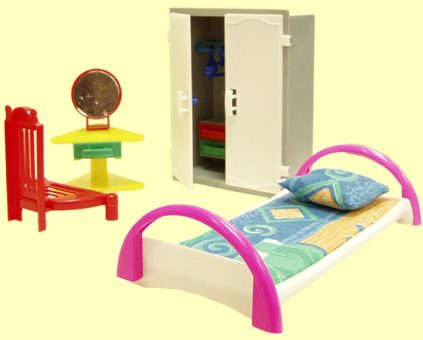 Handling time: 24 days Этот набор игрушечный мебели поможет сделать кукольный дом красивым и уютным. В спальне для любимой куклы будут находиться кровать, шкаф, кресло и трюмо. Игрушка предназначена для сюжетно-ролевых игр. Игры с куклами благоприятно влияют на социализацию и полноценное формирование психики ребенка, учат эмоциональной отзывчивости.