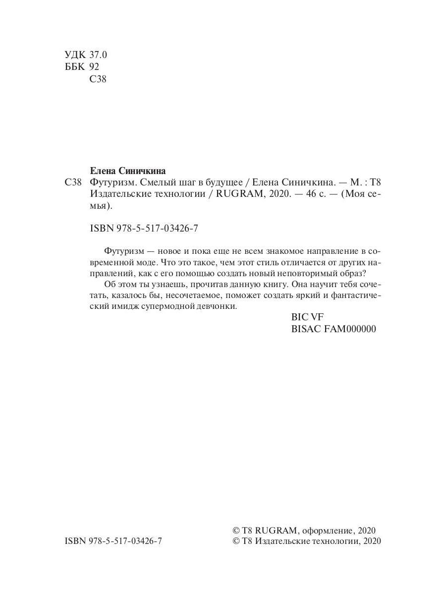 Handling time: 19 days Автор: Синичкина Е., «Футуризм. Смелый шаг в будущее»: Футуризм — новое и пока еще не всем знакомое направление в современной моде. Что это такое, чем этот стиль отличается от других направлений, как с его помощью создать новый неповторимый образ? Об этом ты узнаешь, прочитав данную книгу. Она научит тебя сочетать, казалось бы, несочетаемое, поможет создать яркий и фантастический имидж супермодной девчонки.