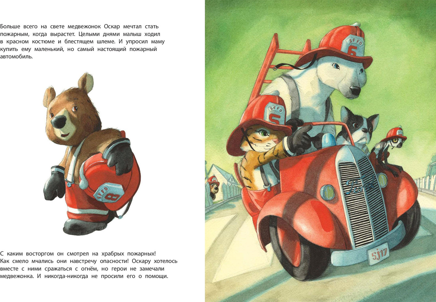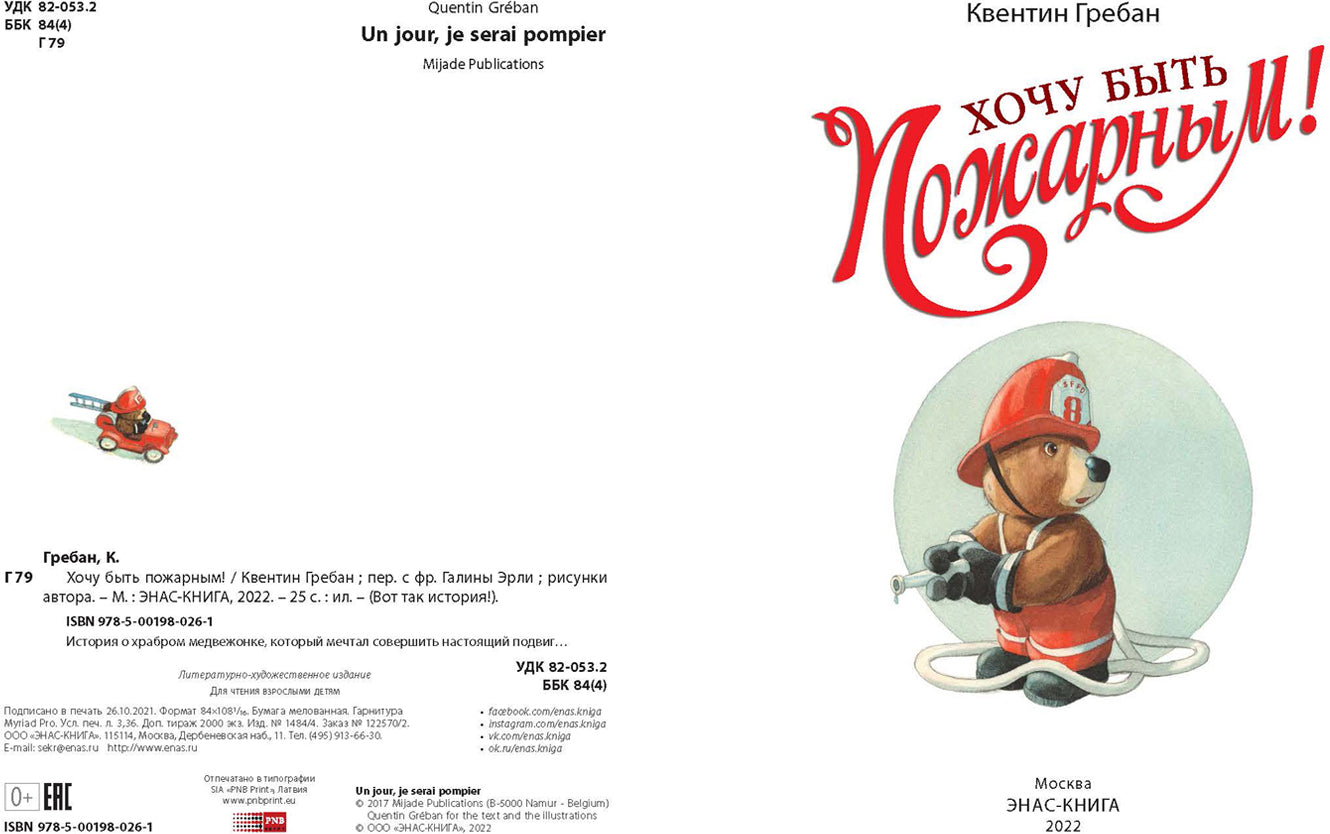 Handling time: 14 days Маленький медвежонок мечтал стать пожарным. Он целыми днями ходил в красном костюме и блестящем шлеме и с восторгом смотрел на настоящих пожарных, когда они смело мчались навстречу опасности. Малышу хотелось вместе с ними сражаться с огнём, но никто не просил его о помощи. И вот он уговорил маму купить ему маленький, но самый настоящий пожарный автомобиль. Поначалу незадачливый герой натворил немало бед, но в конце концов ему удалось совершить настоящий подвиг…Эту смешную историю придумал и нарисовал известный бельгийский художник Квентин Гребан, замечательные рисунки которого хорошо знают и любят малыши во многих странах мира.Для чтения взрослыми детям.