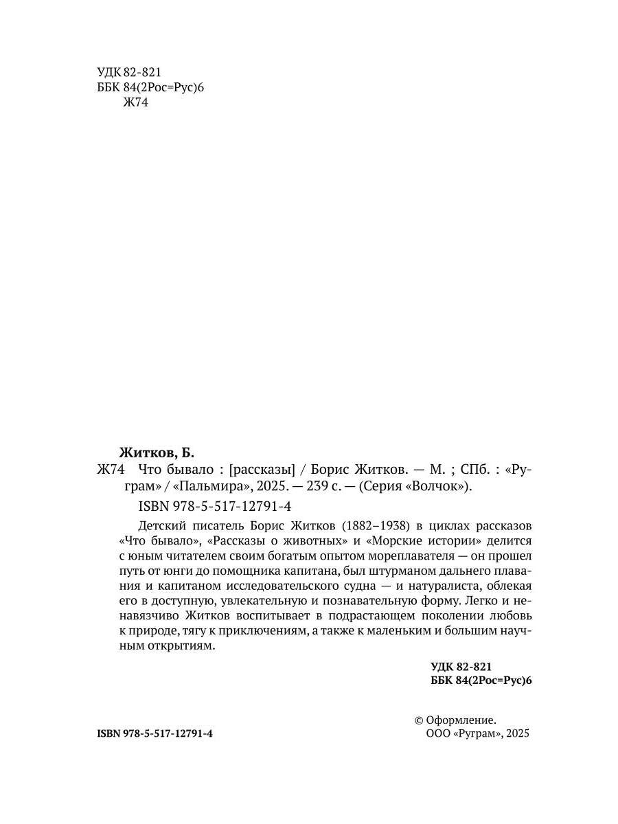 Handling time: 19 days Автор: Житков Борис, «Что бывало: рассказы»: Детский писатель Борис Житков (1882–1938) в циклах рассказов «Что бывало», «Рассказы о животных» и «Морские истории» делится с юным читателем своим богатым опытом мореплавателя - он прошел путь от юнги до помощника капитана, был штурманом дальнего плавания и капитаном исследовательского судна - и натуралиста, облекая его в доступную, увлекательную и познавательную форму. Легко и ненавязчиво Житков воспитывает в подрастающем поколении любовь к природе, тягу к приключениям, а также к маленьким и большим научным открытиям.