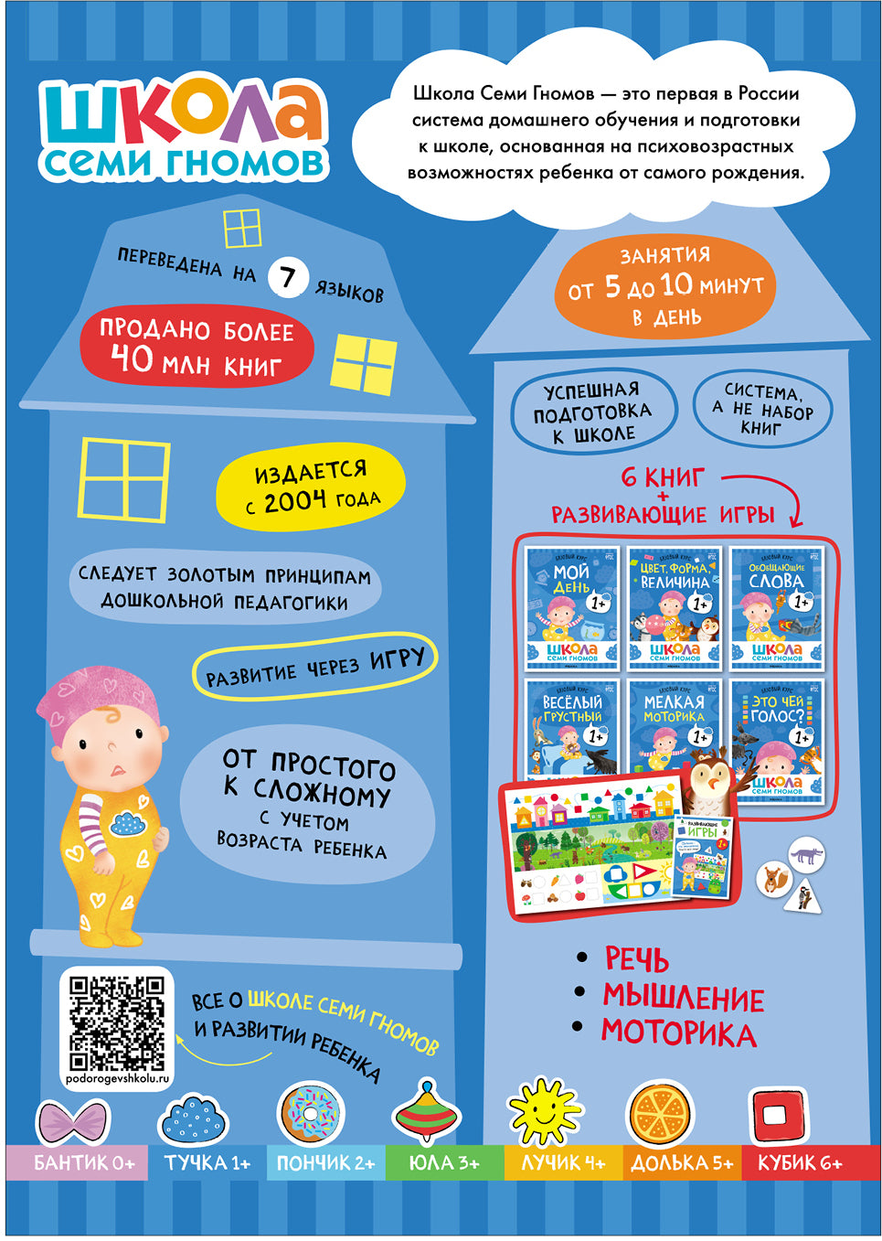 Базовый курс 1+ (Серия «Школа Семи Гномов. Базовый курс»), 6 книг + развивающие игры Школа Семи Гномов – это система, а не набор книг. Комплекс из 6 книг Базового курса направлен на развитие когнитивных способностей ребенка: познавательный интерес, умение думать, анализировать, делать выводы. Система устроена таким образом, чтобы в нужный момент получить необходимые знания. Поэтому все книги в Школе Семи Гномов имеют четкую возрастную адресацию и составлены строго с учетом возрастных возможностей ребенка. Но самое важное, чтобы заниматься...