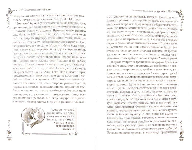 Книга содержит справочные сведения и рекомендации для будущих невест и построена по принципу «вопрос — ответ». Речь идет о выборе мужа, современном сватовстве, подготовке и проведении свадьбы, практике совместного проживания до брака, гостевом и коммунальном браке и браке по расчету. Короче, это книга рецептов для построения счастливой семьи и ее сохранения на долгие годы.
