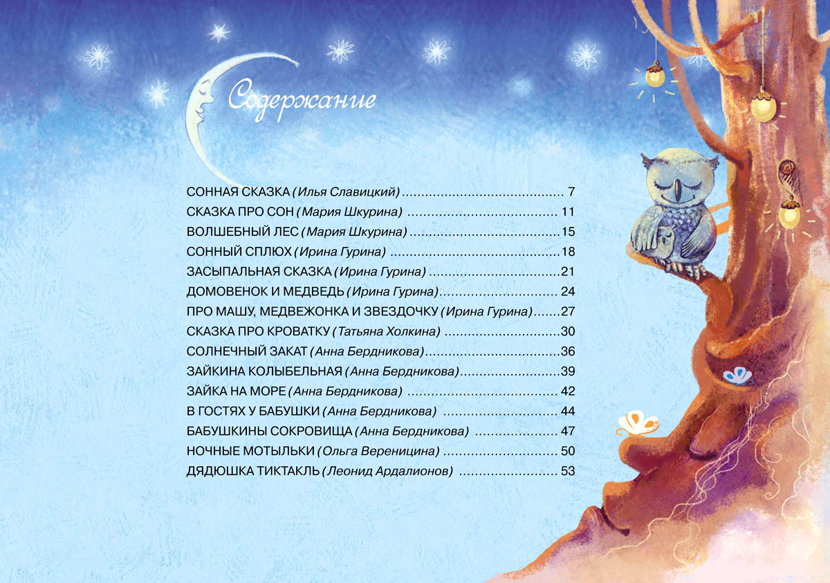 Handling time: 19 days В этой книге собраны особые психологические сказки современных авторов, которые помогут родителям уложить ребенка спать без слез и капризов. Тихие, медитативные истории успокоят самого разбуянившегося ребенка. А сказки, в которых главные герои, подобно малышу, отказываются спать, научат, что всему есть свое время и что сон может быть очень приятным и интересным.  Содержание СОННАЯ СКАЗКА (Илья Славицкий) 7  СКАЗКА ПРО СОН (Мария Шкурина) 11 ВОЛШЕБНЫЙ ЛЕС (Мария Шкурина) 15  СОННЫЙ СПЛЮХ (Ирина Гурина) 18  ЗАСЫПАЛЬНАЯ СКАЗКА (Ирина Гурина) 21  ДОМОВЕНОК И МЕДВЕДЬ (Ирина Гурина) 24  ПРО МАШУ, МЕДВЕЖОНКА И ЗВЕЗДОЧКУ (Ирина Гурина) 27  СКАЗКА ПРО КРОВАТКУ (Татьяна Холкина) 30 СОЛНЕЧНЫЙ ЗАКАТ (Анна Бердникова) 36  ЗАЙКИНА КОЛЫБЕЛЬНАЯ (Анна Бердникова) 39  ЗАЙКА НА МОРЕ (Анна Бердникова) 42  В ГОСТЯХ У БАБУШКИ (Анна Бердникова) 44  БАБУШКИНЫ СОКРОВИЩА (Анна Бердникова) 47  НОЧНЫЕ МОТЫЛЬКИ (Ольга Вереницина) 50  ДЯДЮШКА ТИКТАКЛЬ (Леонид Ардалионов) 53