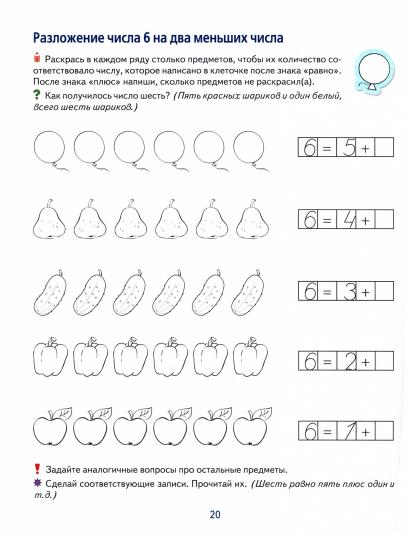 Первые задания направлены на выявление методов к созданию данной программной задачи. Затем даются задания по распределению чисел на два меньших, составлению чисел из двух меньших, нахождению и созданию несоответствий между двумя числами. Все задачи решаются с помощью практических заданий (раскрась, свяжи, дорисуй, отгадай).