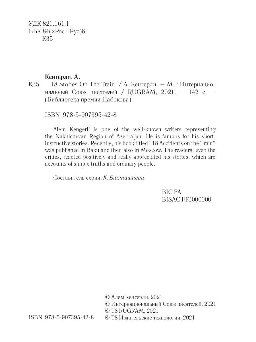 Handling time: 19 days Автор: Кенгерли А., «18 Stories On The Train»: Alem Kengerli is one of the well-known writers representing the Nakhichevan Region of Azerba? an. He is famous for his short, instructive stories. Recently, his book titled “18 Accidents on the Train” was published in Baku and then also in Moscow. The readers, even the critics, reacted positively and really appreciated his stories, which are accounts of simple truths and ordinary people.
