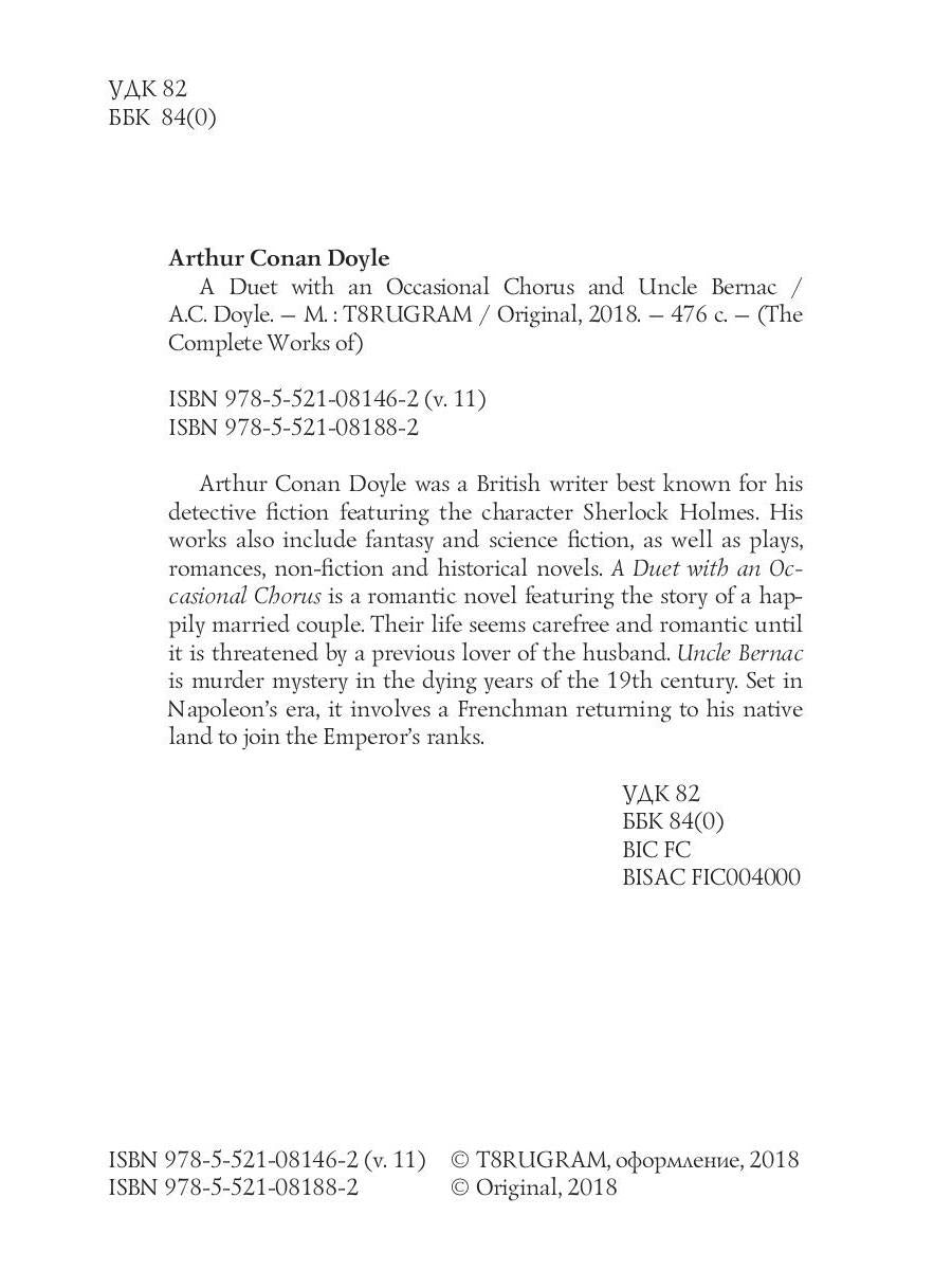 Handling time: 19 days Автор: Doyle Arthur Conan, «A Duet with an Occasional Chorus and Uncle Bernac = Дуэт в сопровождении случайного хора и Дядя Бернак. Т. 11.: на англ.яз»: Arthur Conan Doyle was a British writer best known for his detective fiction featuring the character Sherlock Holmes. His works also include fantasy and science fiction, as well as plays, romances, non-fiction and historical novels. A Duet with an Occasional Chorus is a romantic novel featuring the story of a happily married couple. Their life seems carefree and romantic until it is threatened by a previous lover of the husband. Uncle Bernac is murder mystery in the dying years of the 19th century. Set in Napoleon's era, it involves a Frenchman returning to his native land to join the Emperor's ranks.