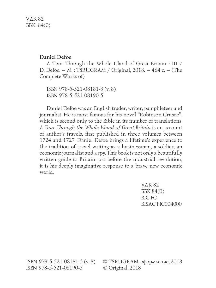 Handling time: 19 days Автор: Defoe Daniel, «A Tour Through the Whole Island of Great Britain III = Тур через Великобританю 3. Т. 8: на англ.яз»: Daniel Defoe was an English trader, writer, pamphleteer and journalist. He is most famous for his novel "Robinson Crusoe", which is second only to the Bible in its number of translations. A Tour Through the Whole Island of Great Britain is an account of author's travels, first published in three volumes between 1724 and 1727. Daniel Defoe brings a lifetime's experience to the tradition of travel writing as a businessman, a soldier, an economic journalist and a spy. This book is not only a beautifully written guide to Britain just before the industrial revolution; it is his deeply imaginative response to a brave new economic world.