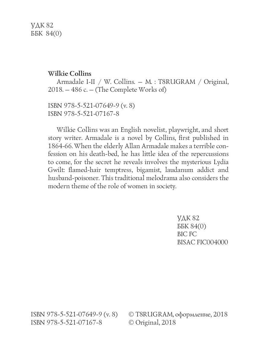 Handling time: 19 days Автор: Collins William Wilkie, «Armadale 1-2I = Армадейл 1-2 (на английском языке)»: Wilkie Collins was an English novelist, playwright, and short story writer. Armadale is a novel by Collins, first published in 1864-66. When the elderly Allan Armadale makes a terrible confession on his death-bed, he has little idea of the repercussions to come, for the secret he reveals involves the mysterious Lydia Gwilt: flamed-hair temptress, bigamist, laudanum addict and husband-poisoner. This traditional melodrama also considers the modern theme of the role of women in society.