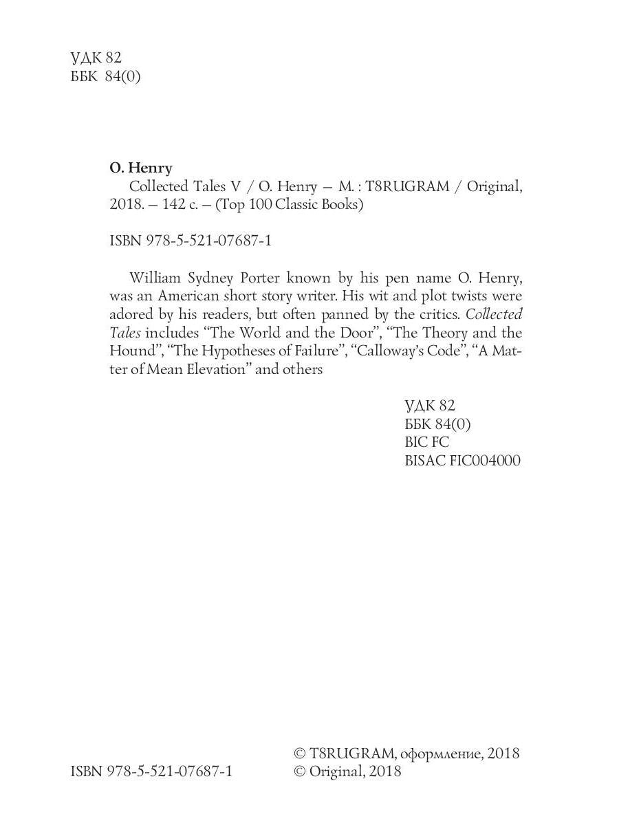Handling time: 19 days Автор: Henry O., «Collected Tales V = Сборник рассказов V: на англ.яз»: William Sydney Porter known by his pen name 0. Henry, was an American short story writer. His wit and plot twists were adored by his readers, but often panned by the critics. Collected Tales includes "The World and the Door", "The Theory and the Hound", "The Hypotheses of Failure", "Calloway's Code", "A Matter of Mean Elevation" and others